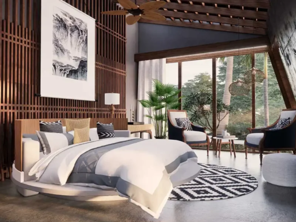 Drawing inspiration from the sloping roofs of a typical Hawaiian villa, the terracotta-clad exterior walls make a bold statement. These walls are delicately juxtaposed with the wooden deck and concrete-finished walls, standing tall, like those of a sanctuary.