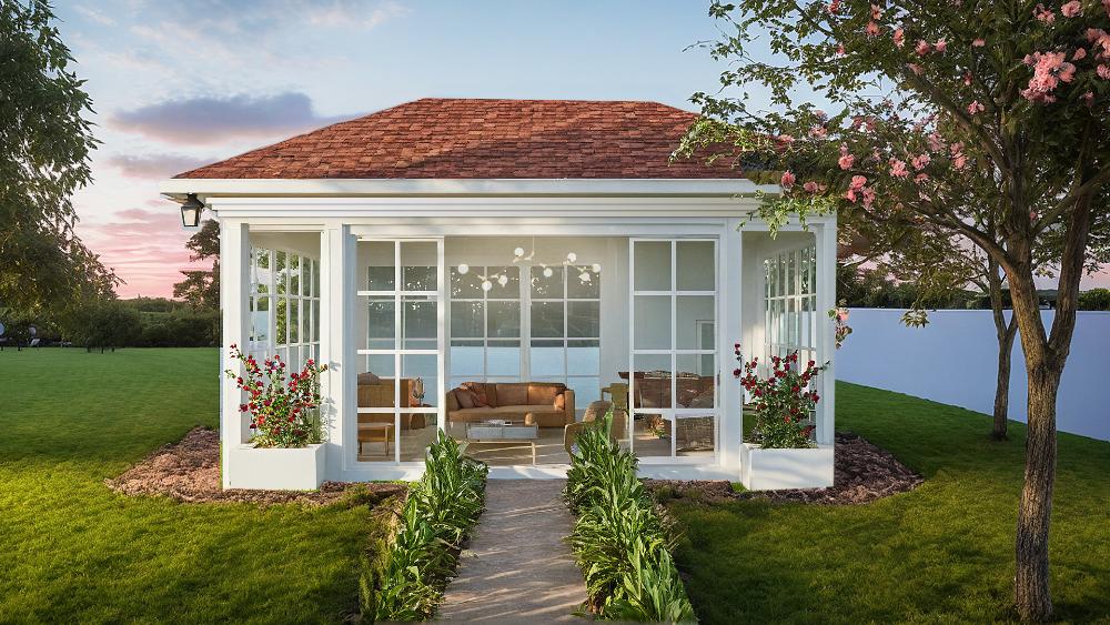 A refined garden pavilion designed in a classical style, featuring a sloped terracotta roof and expansive glass panels. It offers a bright, elegant space that blends indoor comfort with the outdoors, ideal for relaxation, leisure, or intimate gatherings.