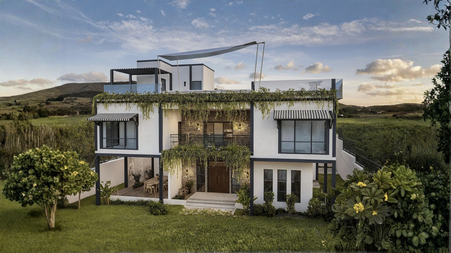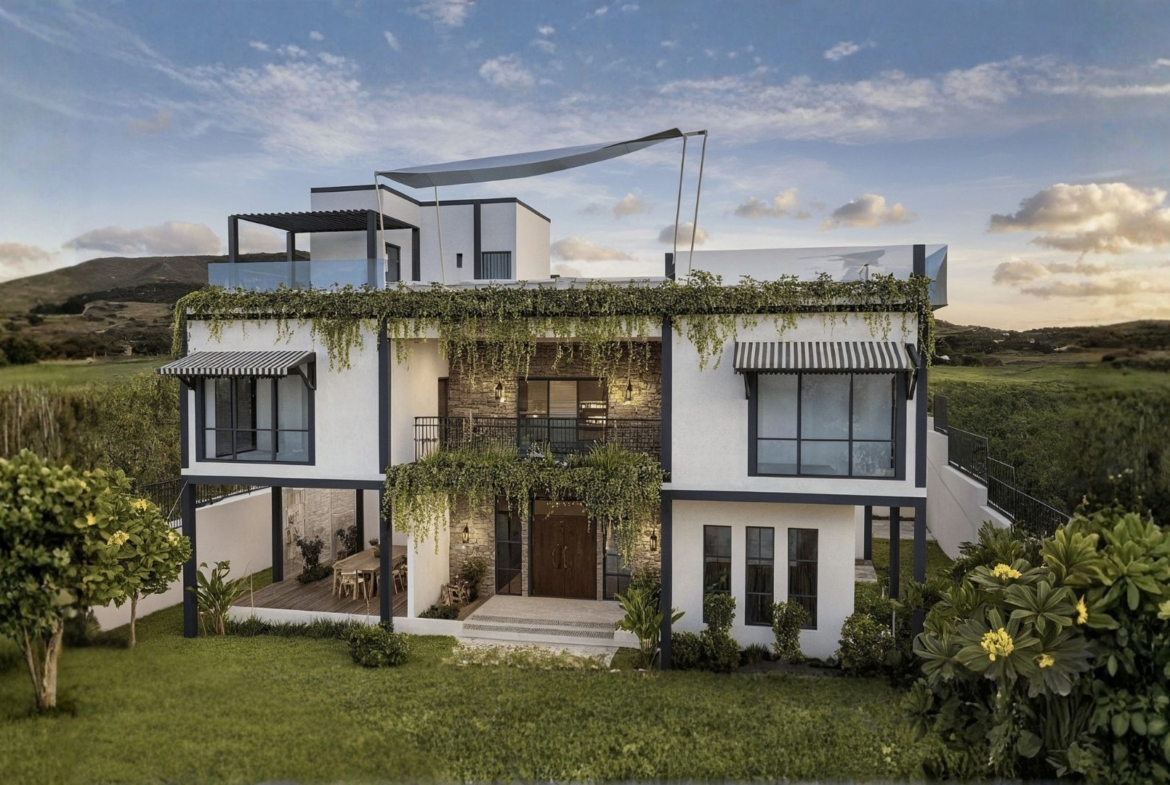A residential retreat designed around interconnected courtyards, shaded verandas, and semi-open walkways that promote outdoor living and social interaction. Inspired by Mediterranean architecture, the project features light facades, sloping tiled roofs, and soft blue accents, framed by lush landscaping. Passive cooling strategies and human-scaled transitions create a calm, intimate environment .