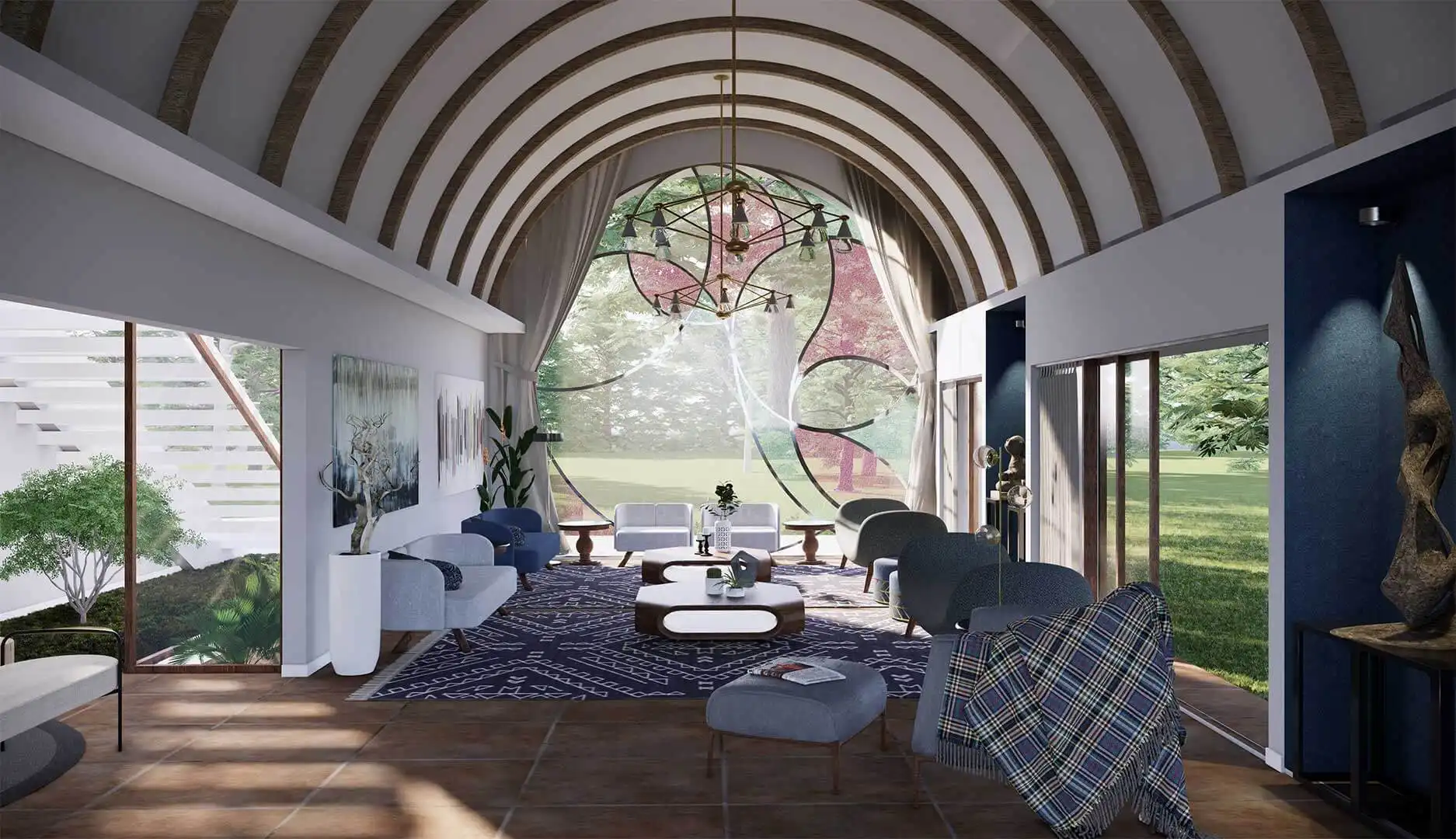 Welcoming visitors in, the inclined arched entrance is flanked stairways that lead to the rooftop terrace. The glass slits allow filtered light into the landscape pockets. The entrance foyer is the axis that brings the other spaces in the home together. The living area, kitchen, dining room and deck on one end of this axis are enveloped by a 25-feet lofty, vaulted roof that reduces direct heat gain. Tinted rays of light in shades of pink and blue bounce off the white stucco walls, adding a touch of art and drama. Framed by the stairways, the caved semi-open pool extends outdoor and is like a gateway to the Mediterranean waters of Spain. Overlooking the pool are the study room and kitchen garden.