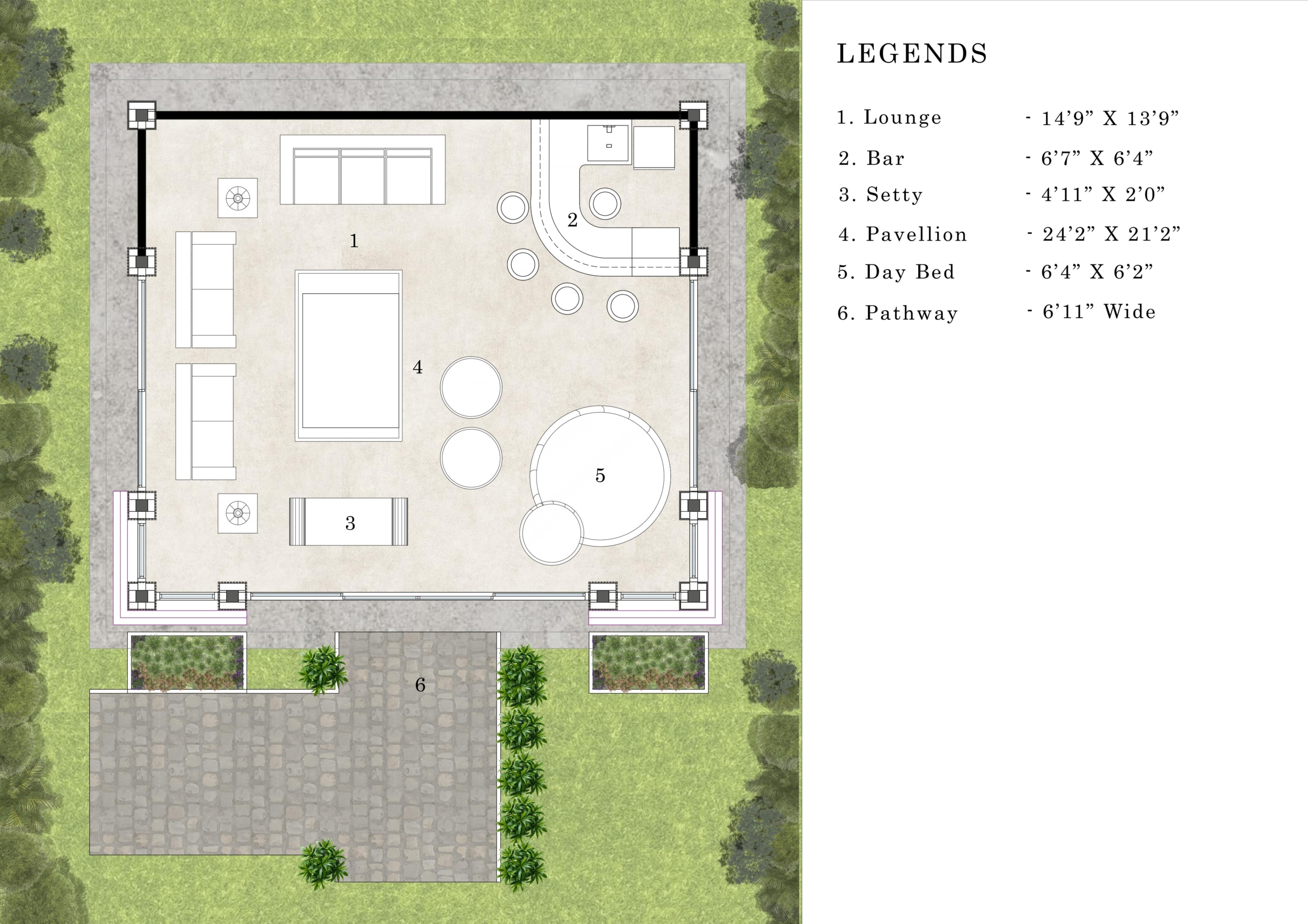 1 Lounge, 1 Bar Strip, 1 Setty, 1 Pavilion, 1 Day bed