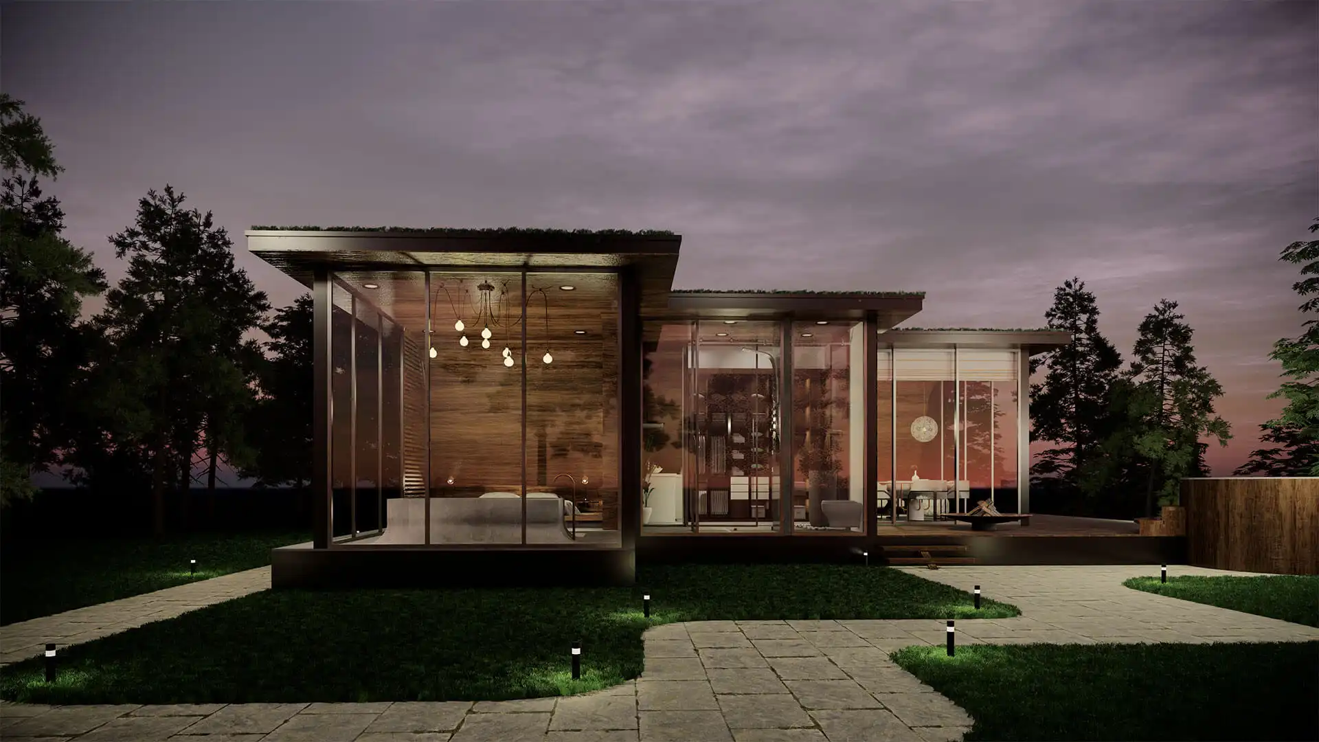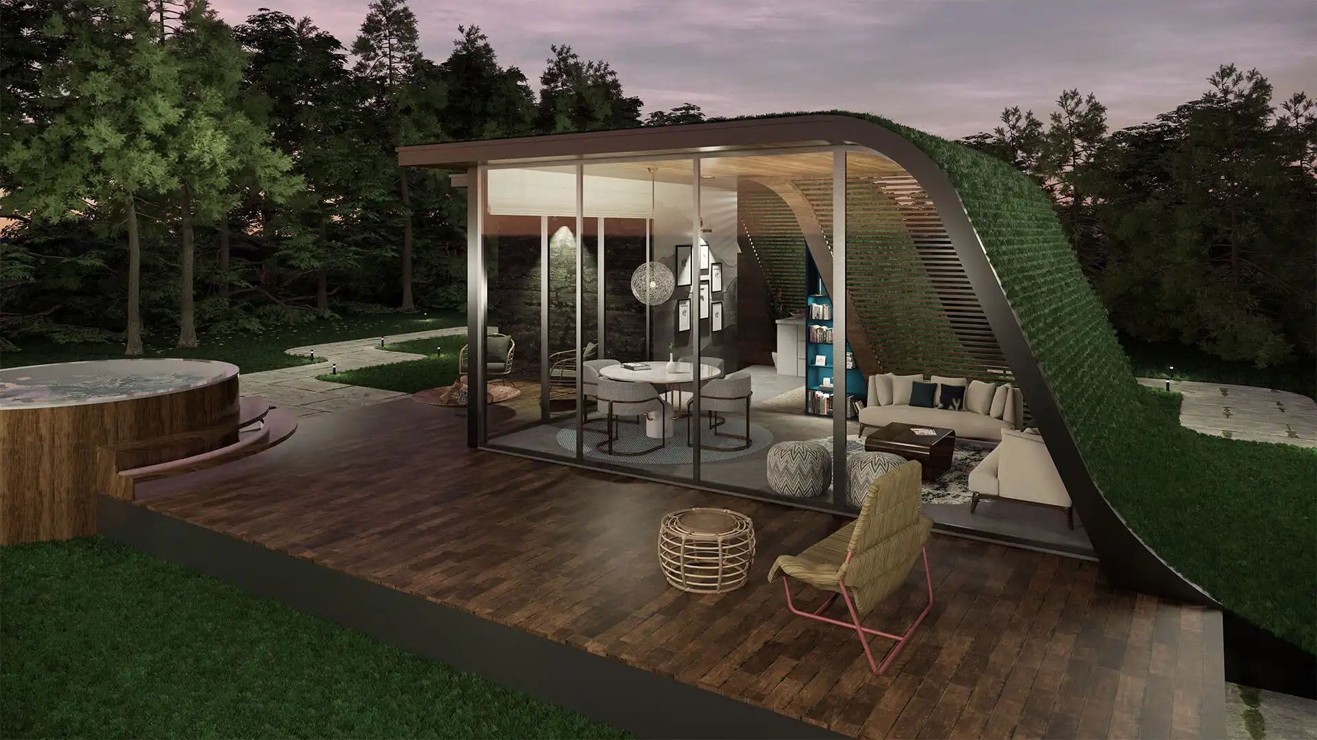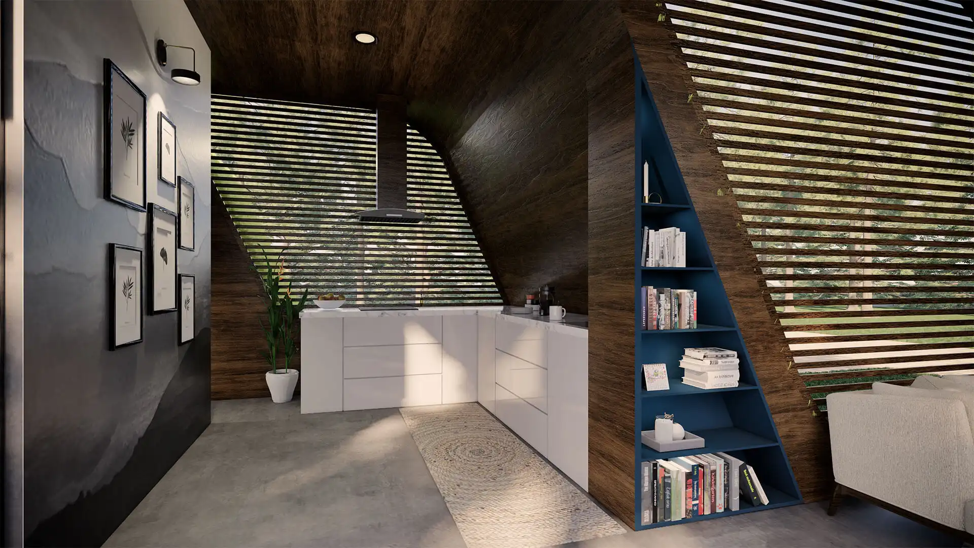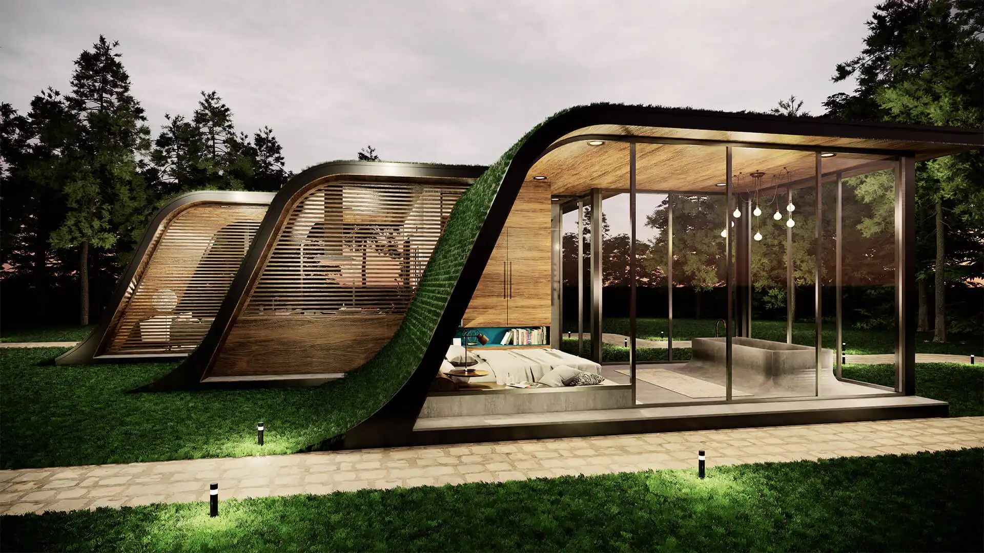 The open plan with the unbridled use of glass with wooden louvres, values privacy while creating a unifying bond with the surrounding landscape. While the pod emerges with its bold frame, the green roof melts it into nature. Through a contemporary design, Greenville optimizes space to fit all your daily needs and creates a nature-weaved experience for your adventurous soul — truly an innate affair worth cherishing!