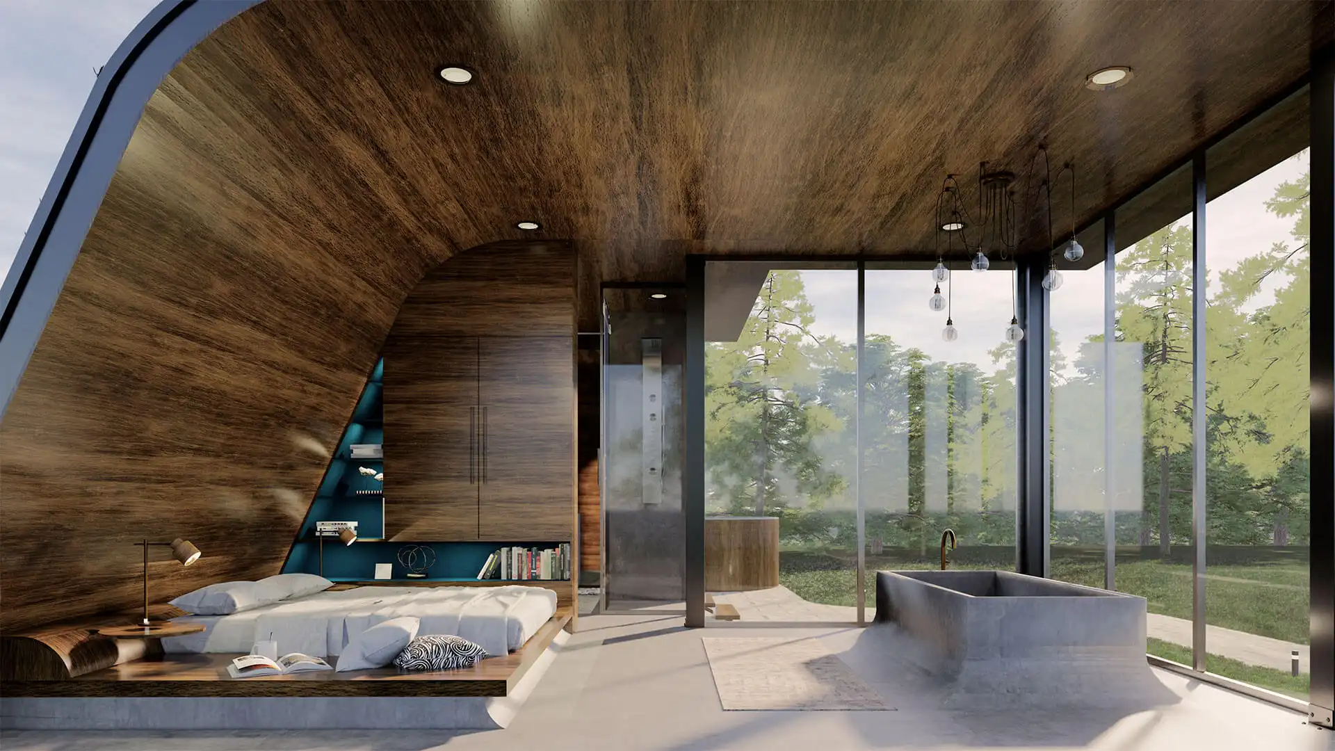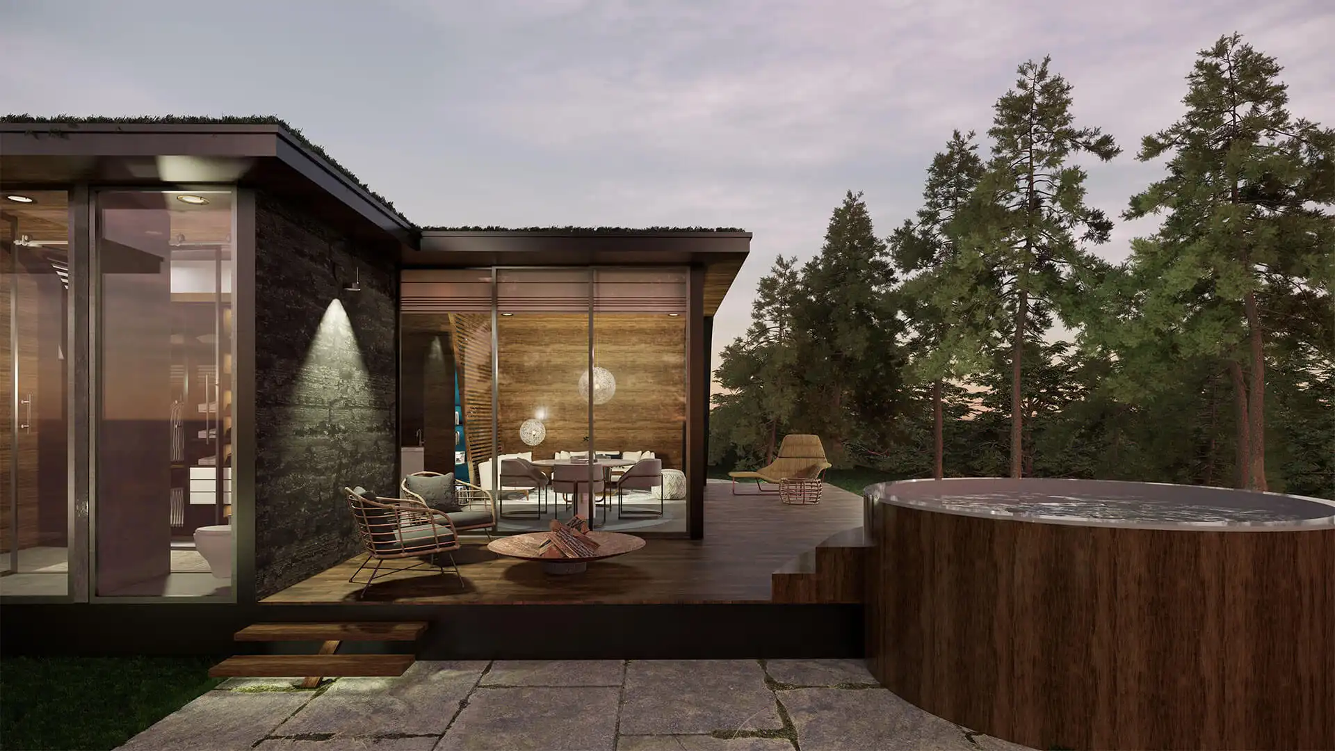 A lavishly planned deck, living, and dining attached with a smart kitchen are designed to optimize functionality while accentuating the space. The common areas follow a plush bedroom, with a utilitarian design for optimized storage. The luscious bedding overlooks nature through floor-to-ceiling openings. A stand-alone bathtub emerges from the micro cement floor adding an earthy touch. A bonfire pit and a circular plunge pool with sunbathing chairs create the perfect social setting to host gatherings of friends and family.