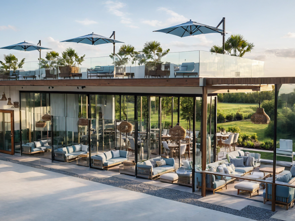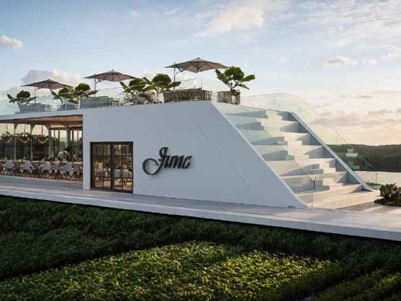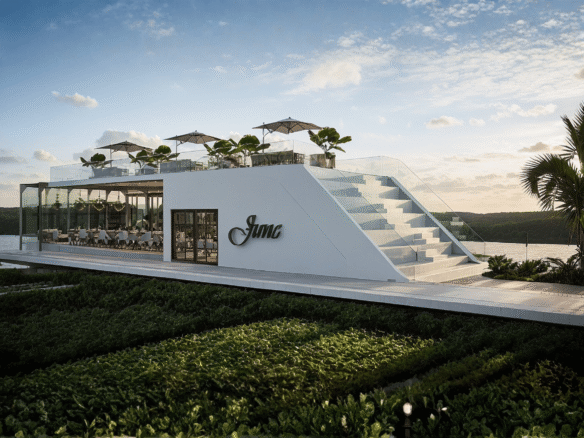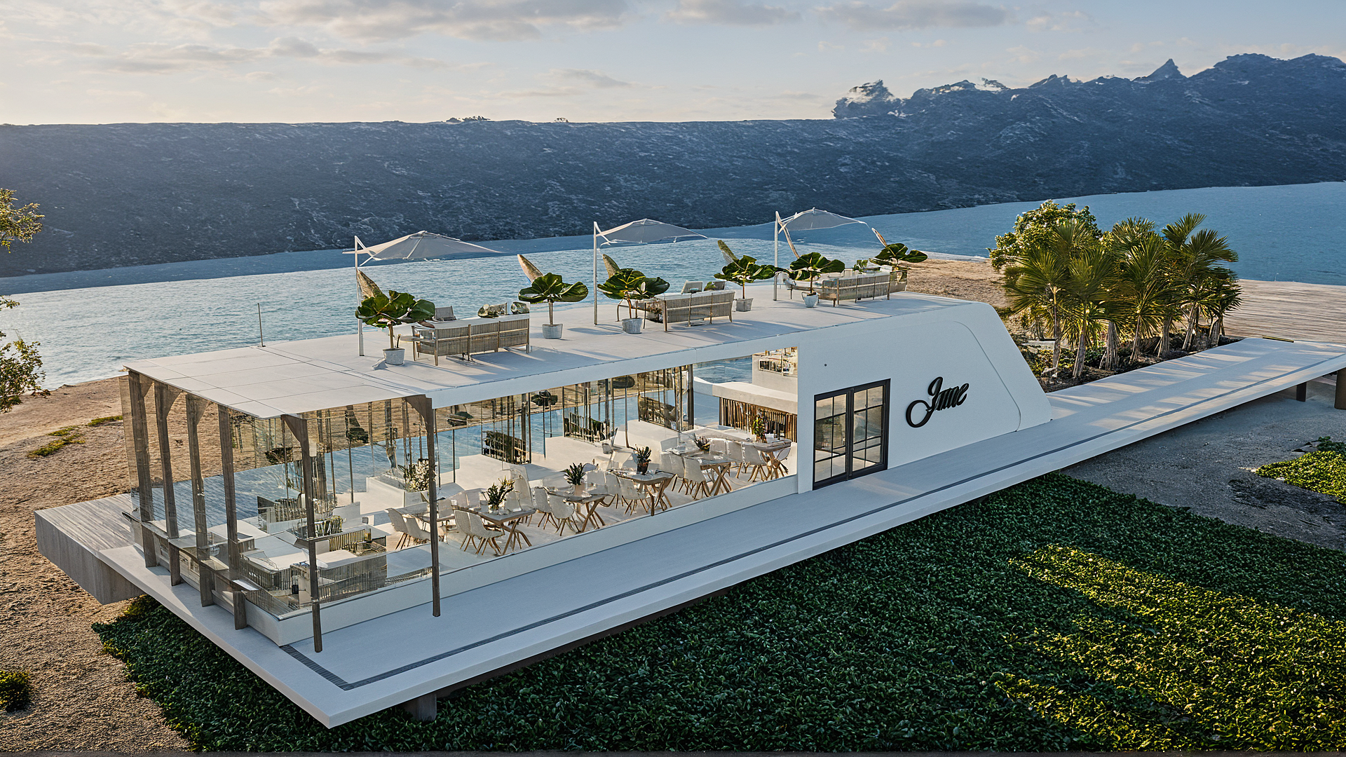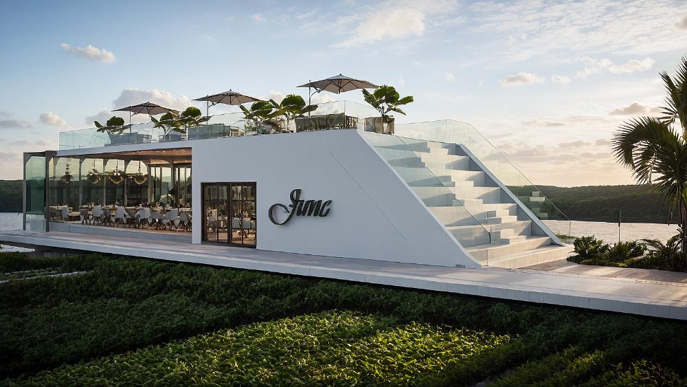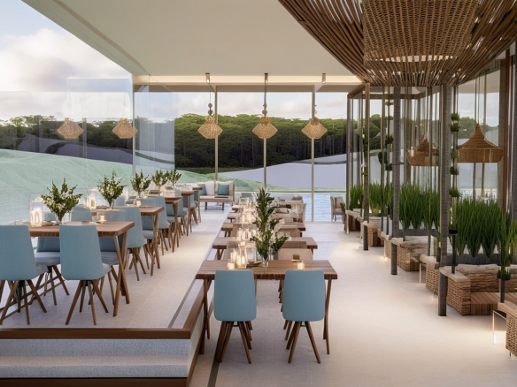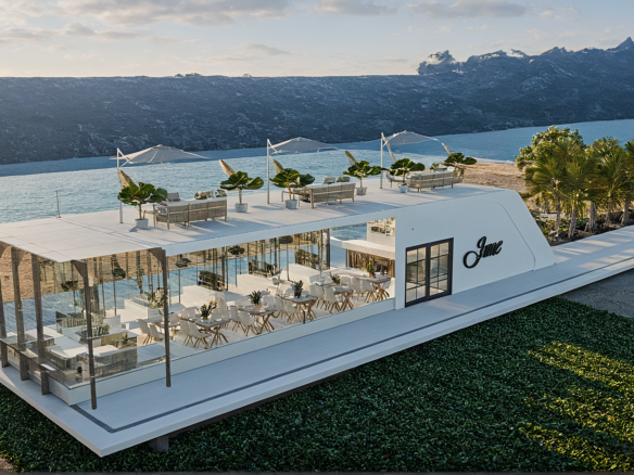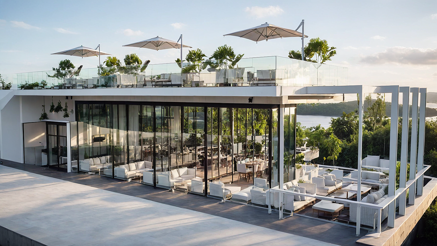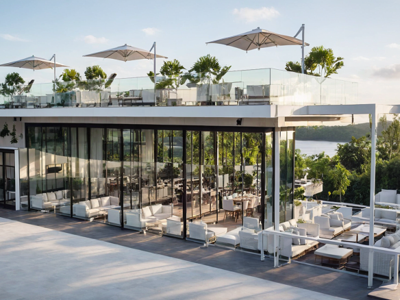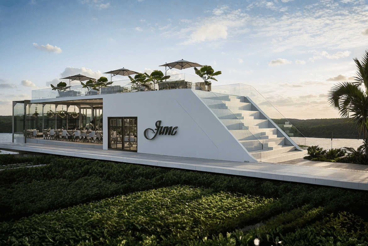 A modern waterfront restaurant featuring glass walls, open terraces, and rooftop seating, designed to offer panoramic views and a relaxed, refined dining experience in harmony with nature.