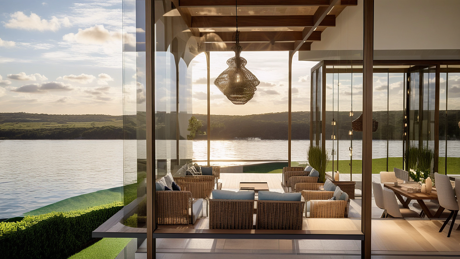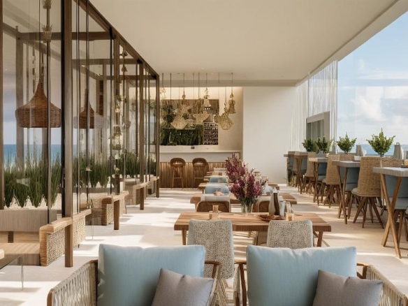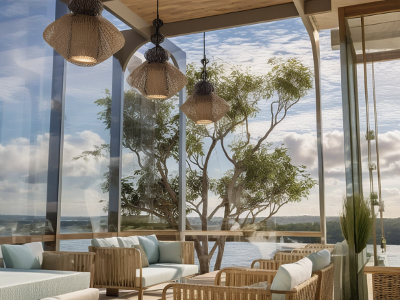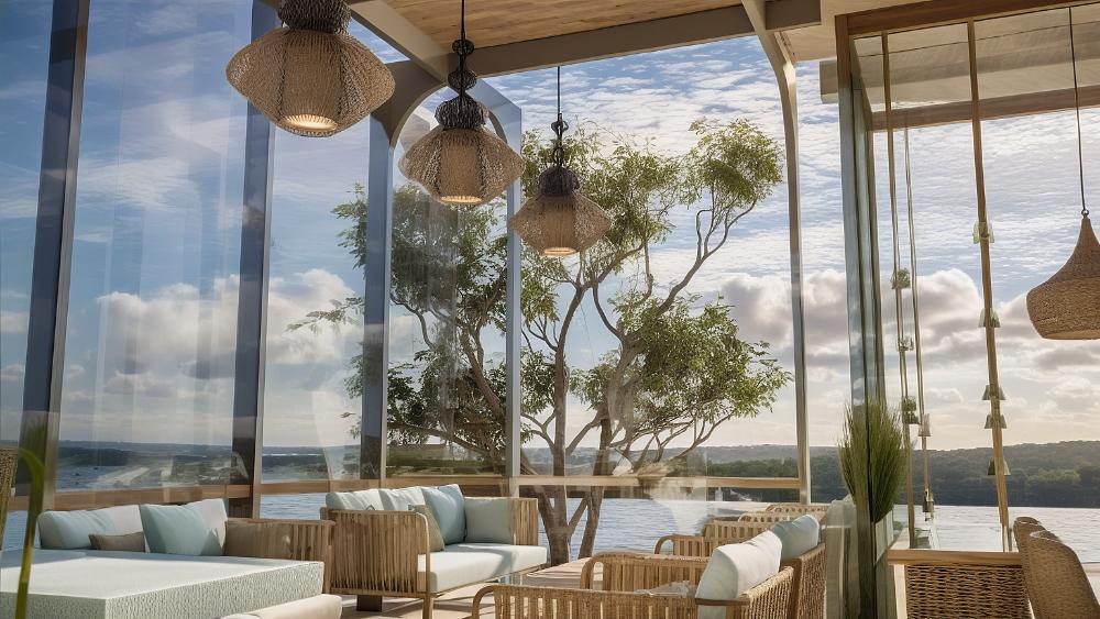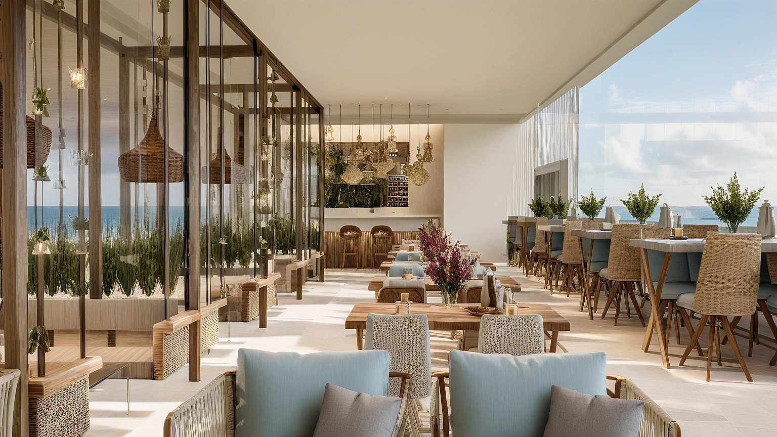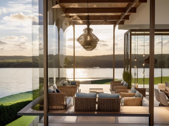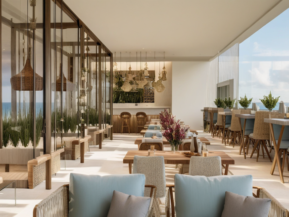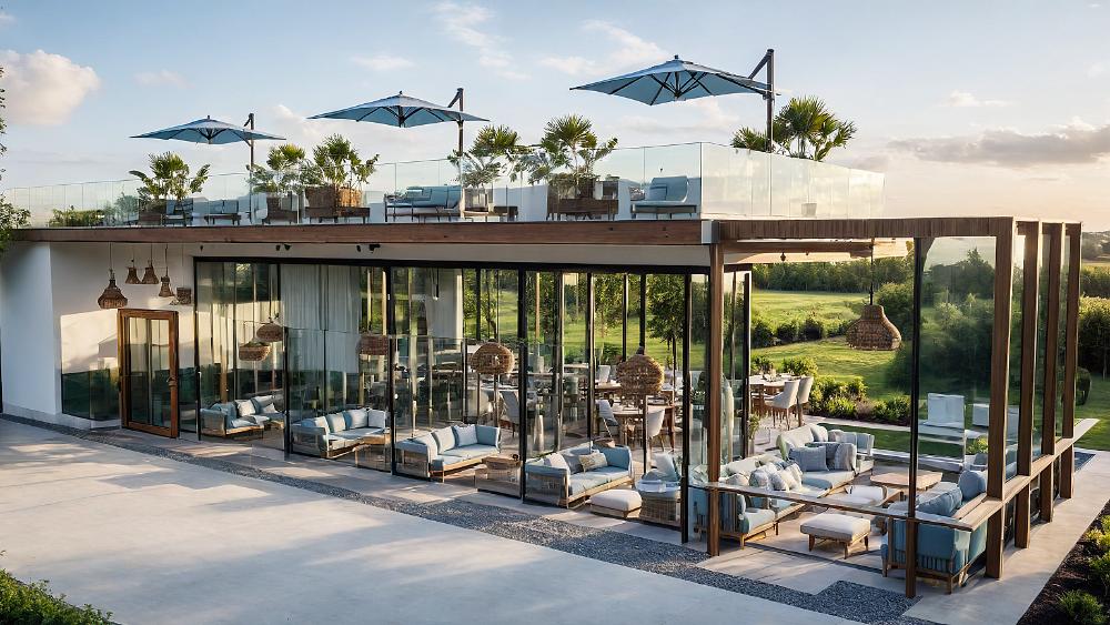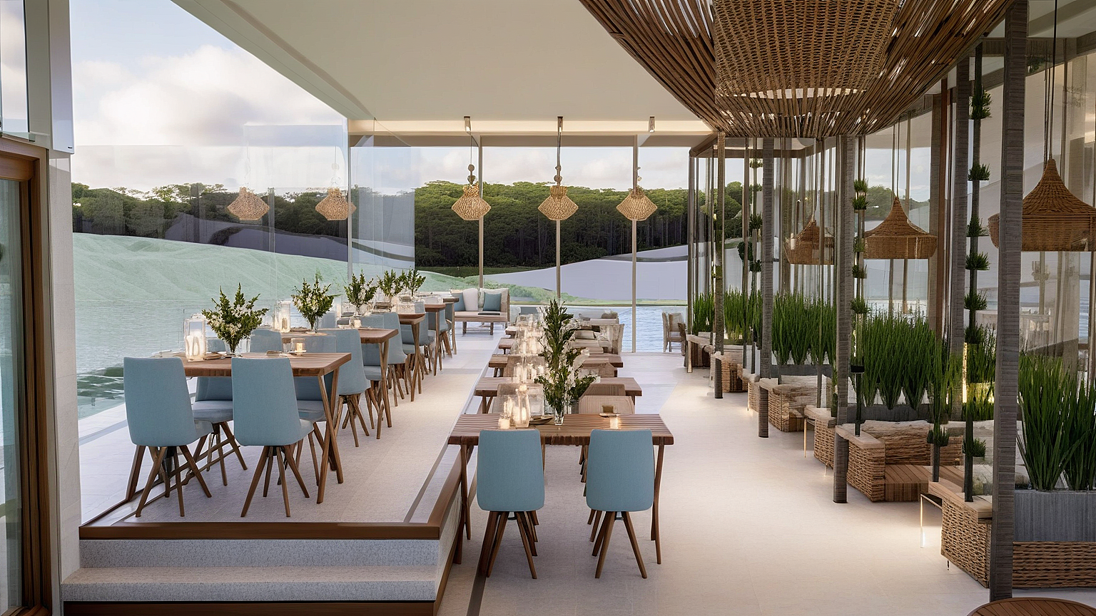 A modern waterfront restaurant featuring glass walls, open terraces, and rooftop seating, designed to offer panoramic views and a relaxed, refined dining experience in harmony with nature.