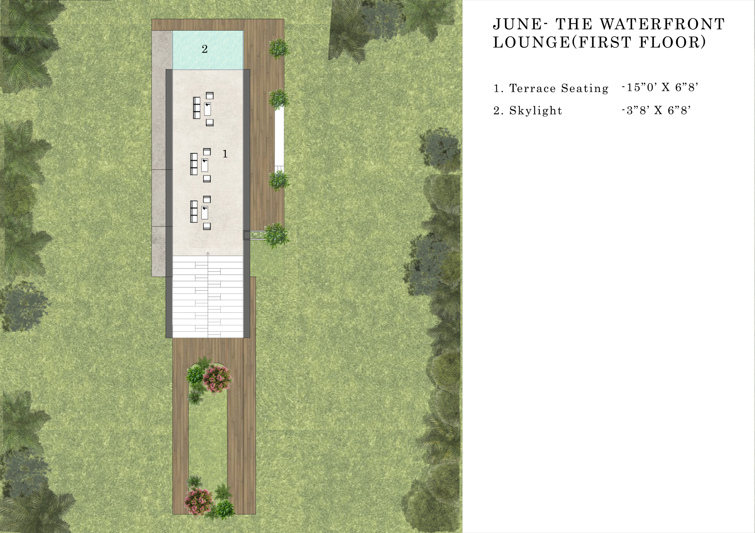 1 Deck, 1 Elevated Dining, 2 Lounge, 4 Swing PODS, 1 Bar Strip, 1 Show kitchen, 1 Kitchen, 2 Powder room, 1 Stepped seating, 1 Terrace seating