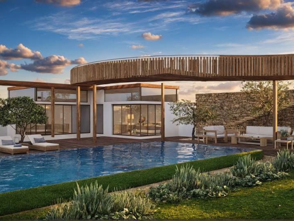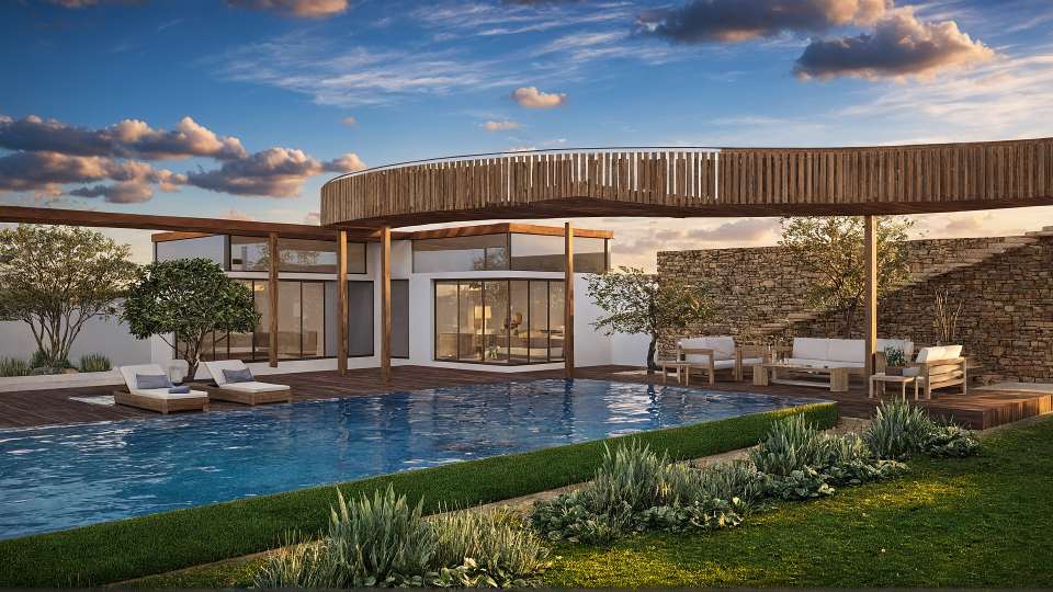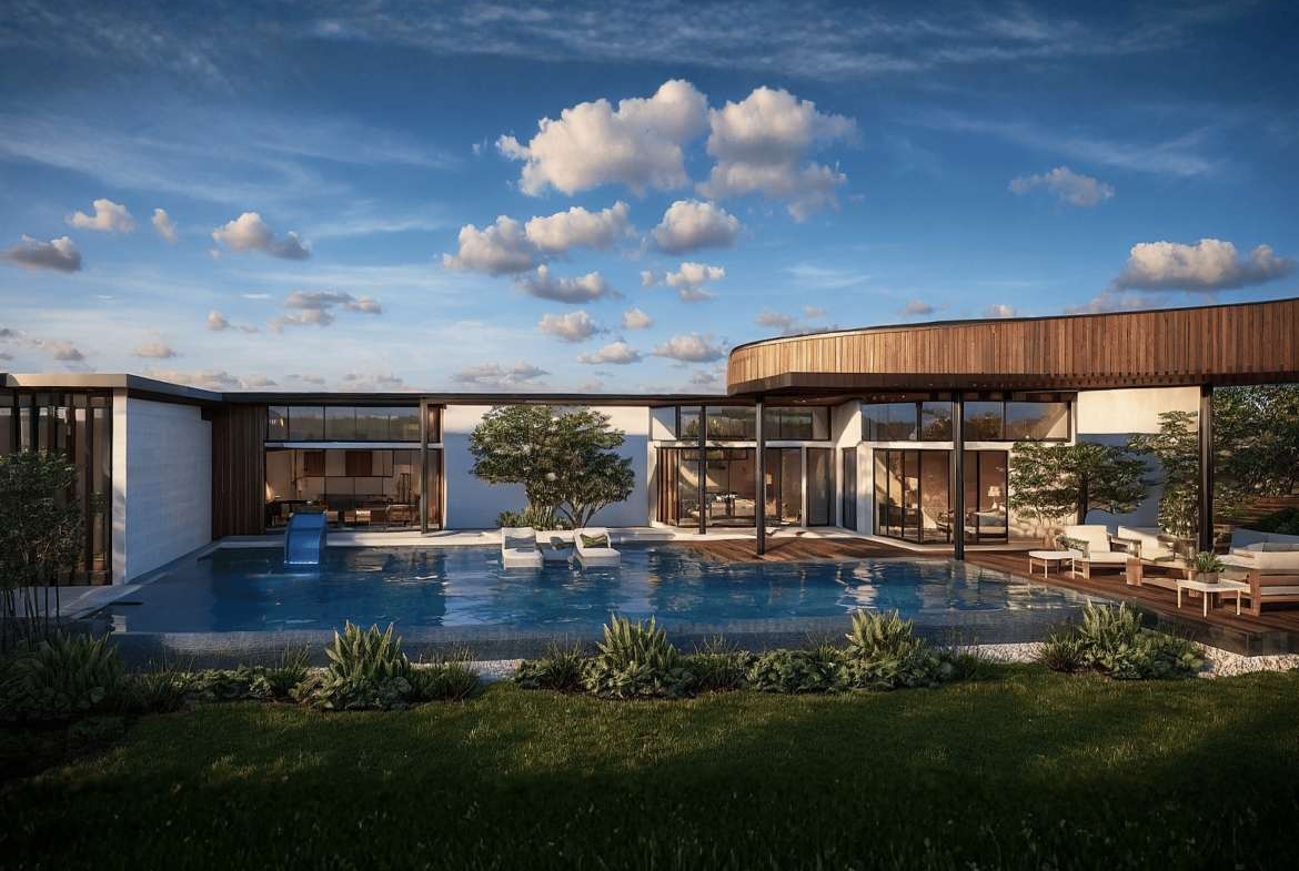 A modern villa with a grand swimming pool designed for larger gatherings and a striking elevated bridge, blending luxury, elegance, and seamless indoor–outdoor living. Designed as a private retreat, this villa showcases a generous swimming pool for larger gatherings and a statement bridge that elevates the overall spatial experience.