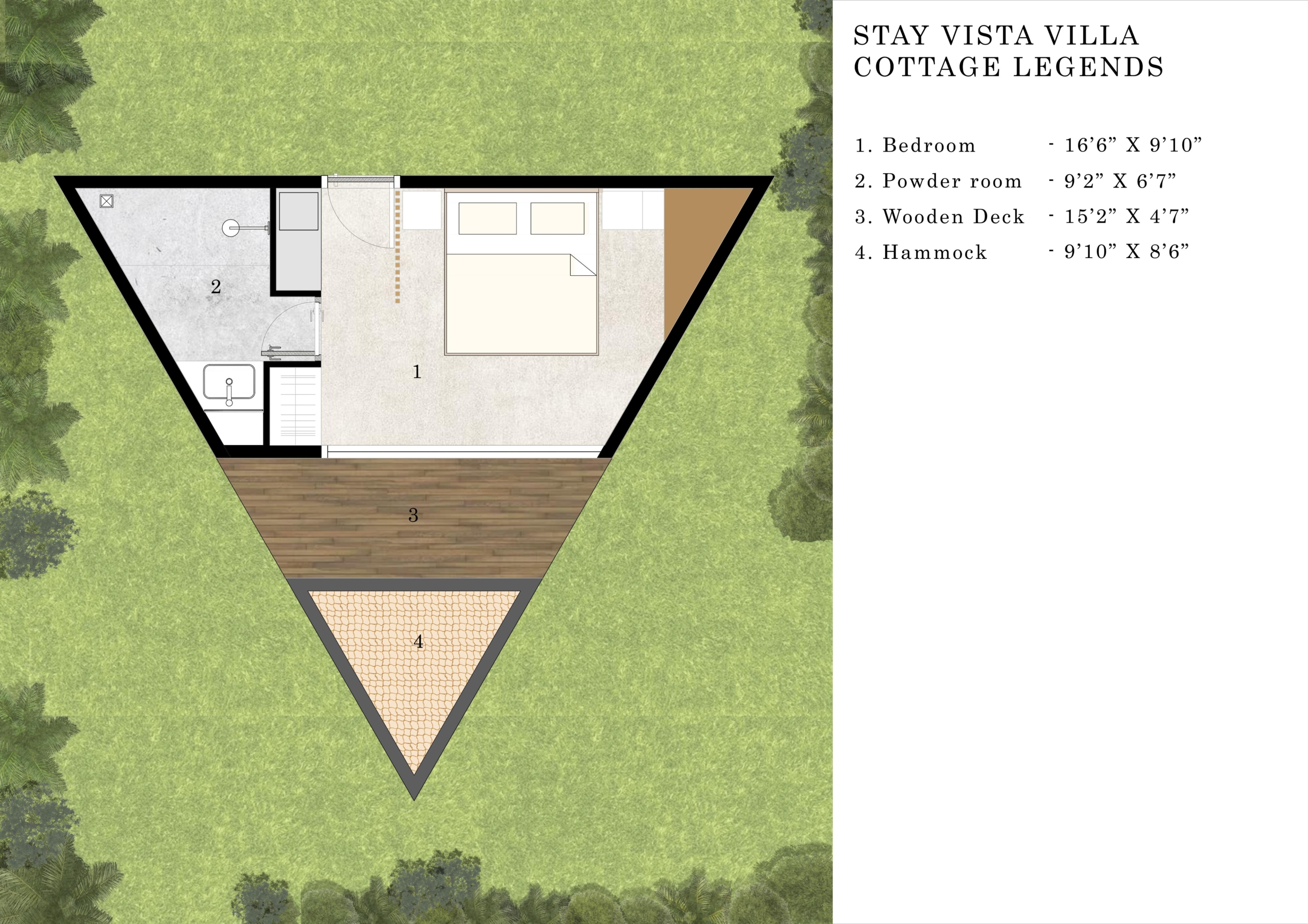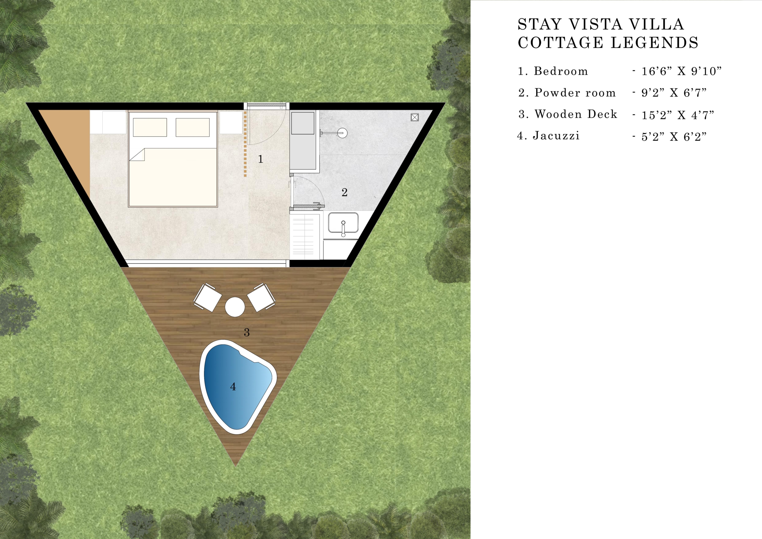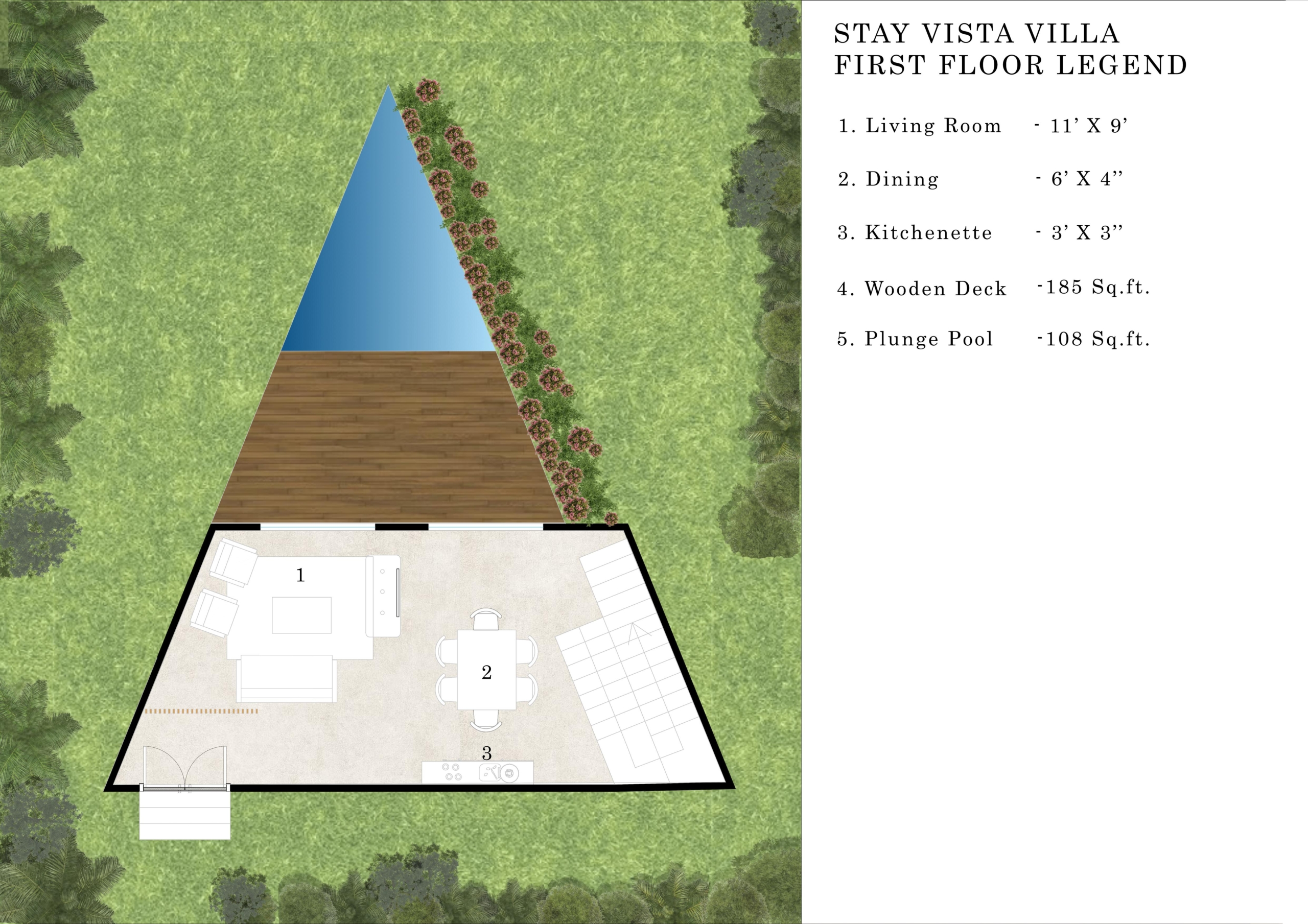 1 Lining room, 1 Kitchenette, 1 Dining Area, 1 Deck, 2 Bedrooms, 2 Powder rooms, 1 Hammock, 1 Plunge Pool(9’10” x 8’6″)