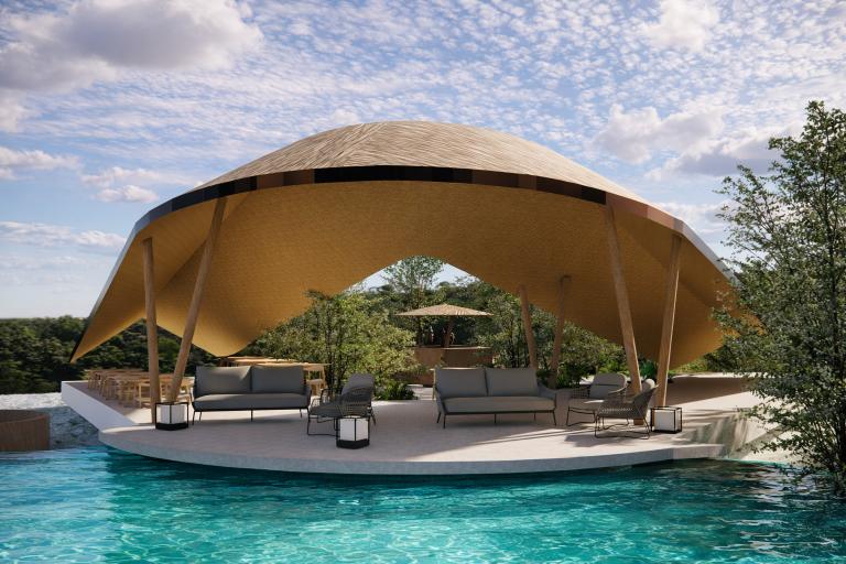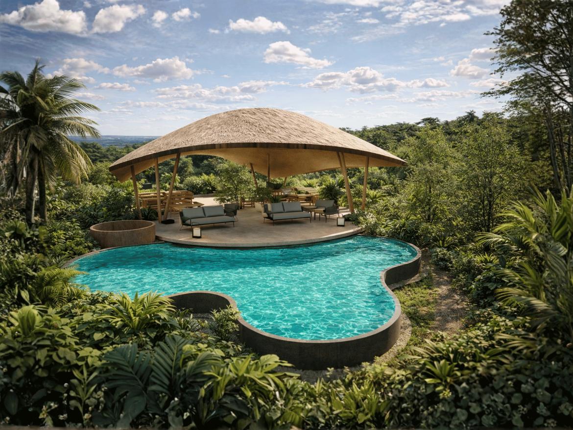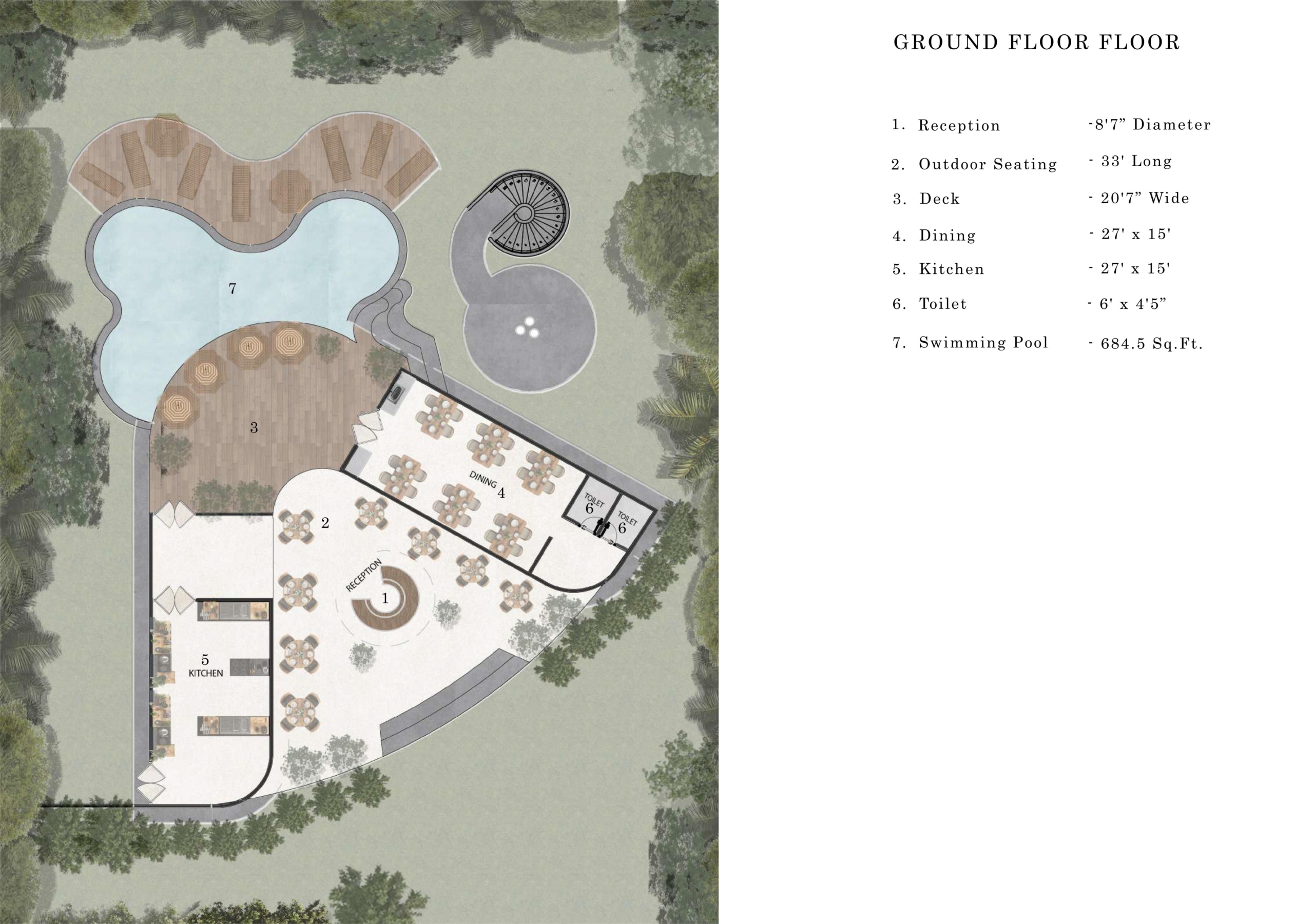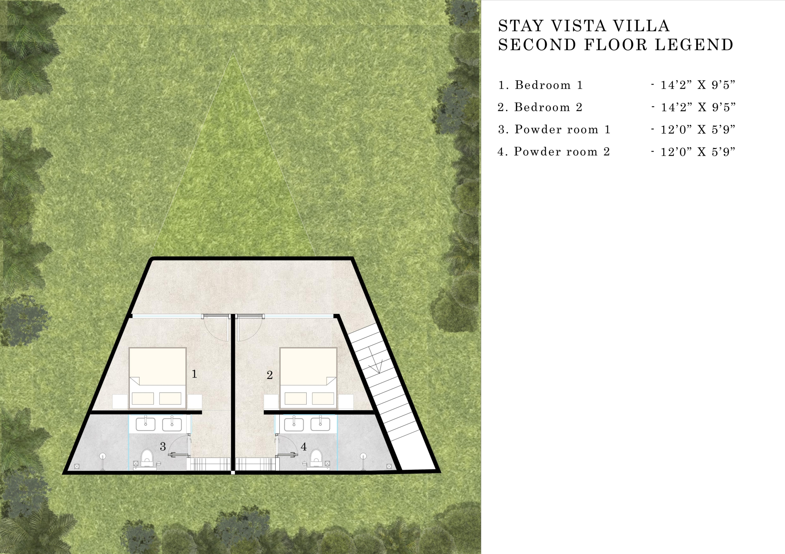 1 Lining room, 1 Kitchenette, 1 Dining Area, 1 Deck, 2 Bedrooms, 2 Powder rooms, 1 Hammock, 1 Plunge Pool(9’10” x 8’6″)