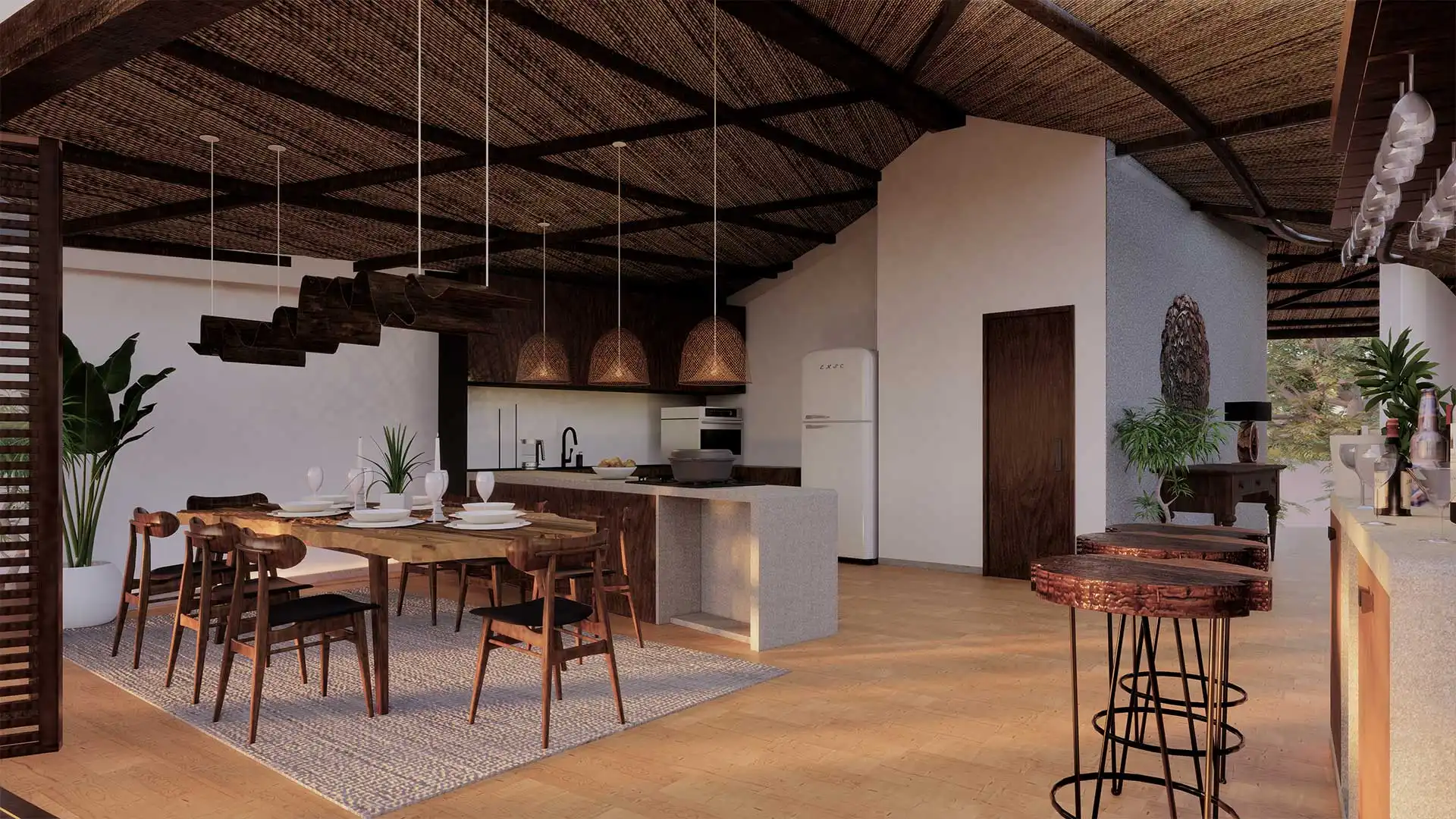 Pristine white walls create a beautiful contrast with the wooden and stone accents, breathing luxury into the villa. The soft upholstery and indoor plants softly complement the natural, raw interior finishes.