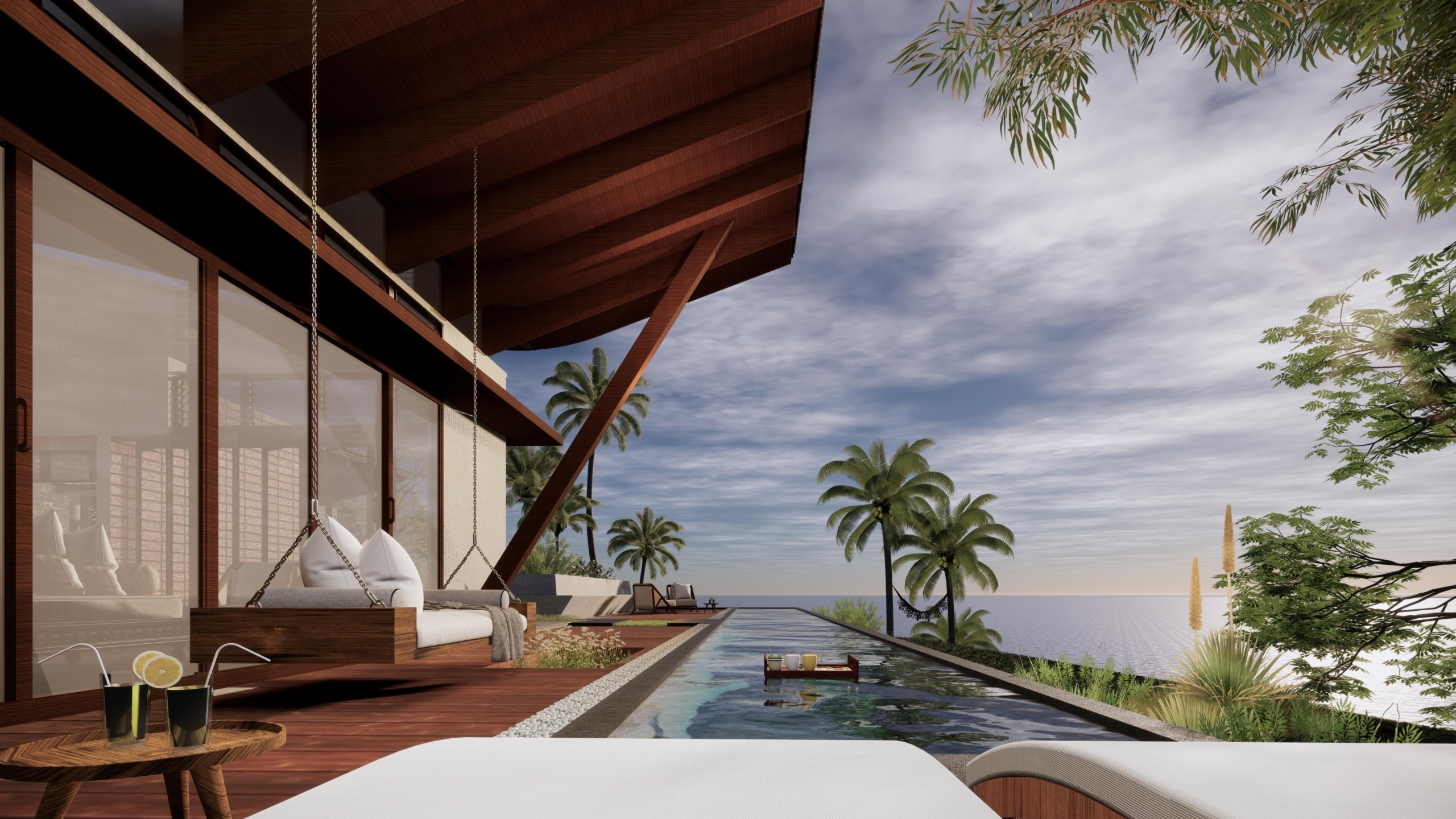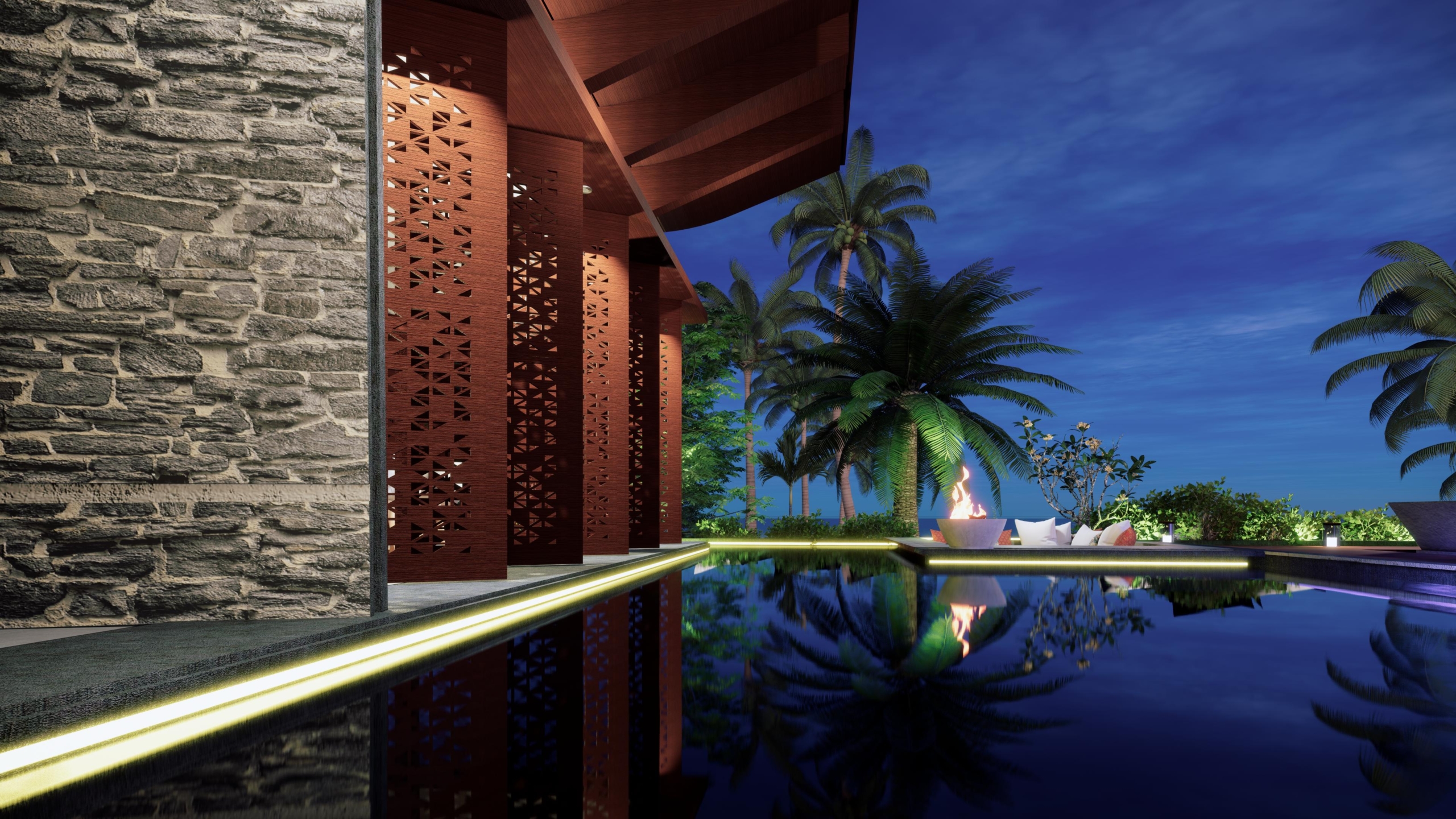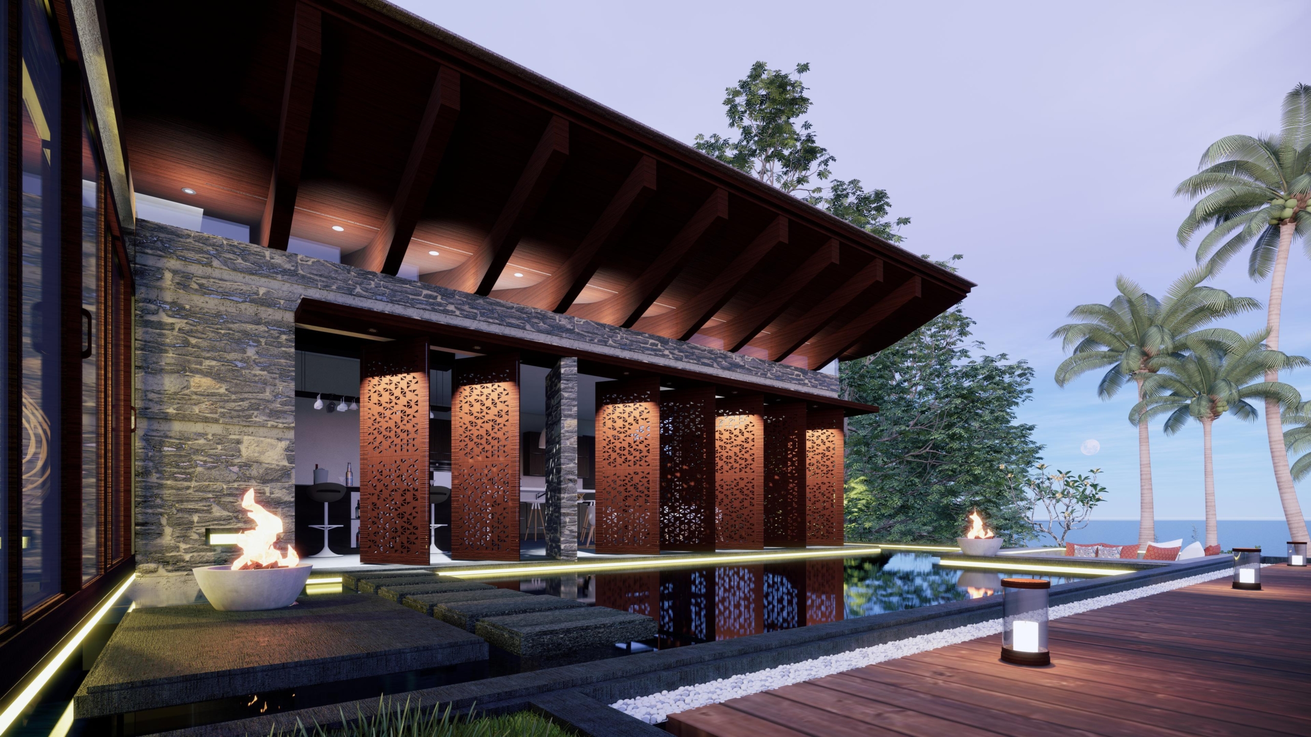 A modern interpretation of the butterfly roof portrays a connection to nature by blending within the panoramic surroundings. Meanwhile, cascading water with its rhythm acts as your very own spa experience through natural elements.