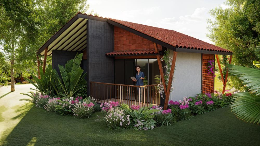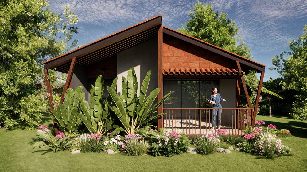 A refined garden pavilion designed in a classical style, featuring a sloped terracotta roof and expansive glass panels. It offers a bright, elegant space that blends indoor comfort with the outdoors, ideal for relaxation, leisure, or intimate gatherings.