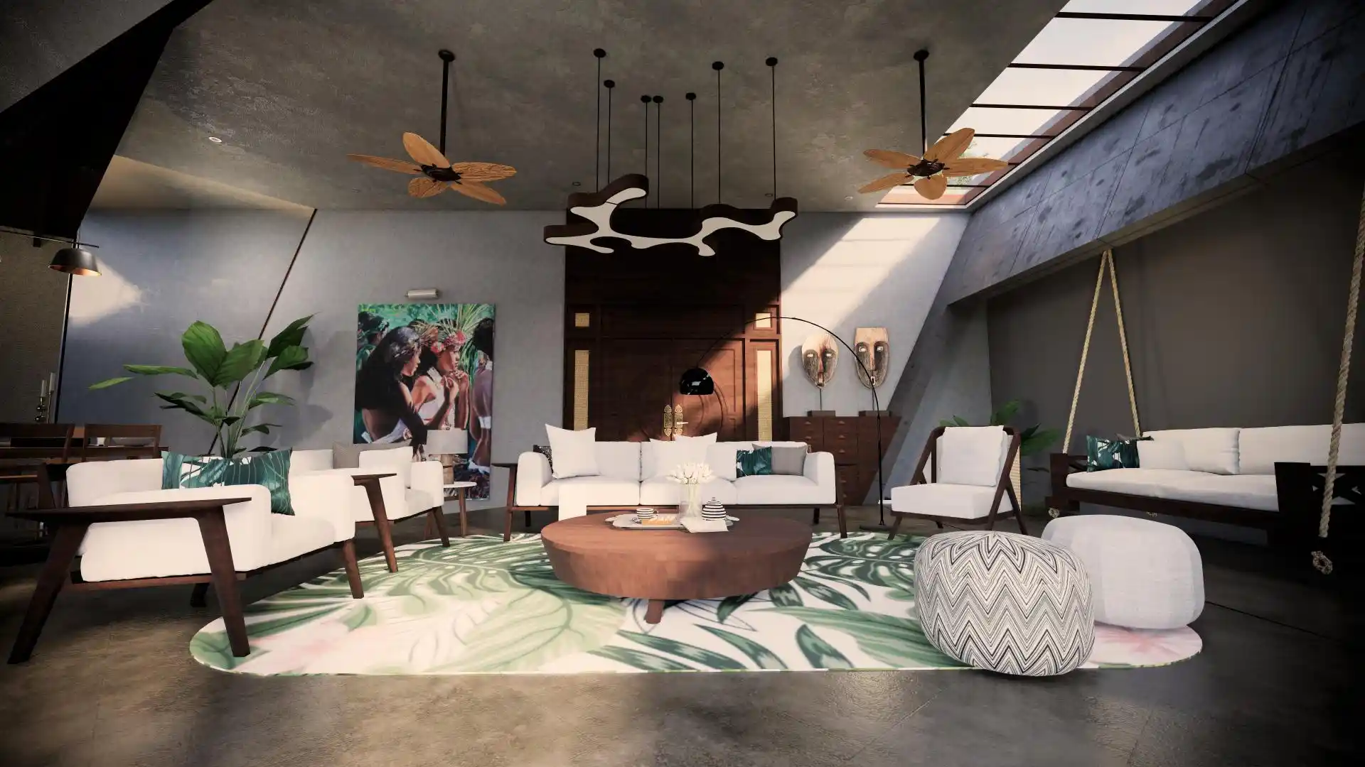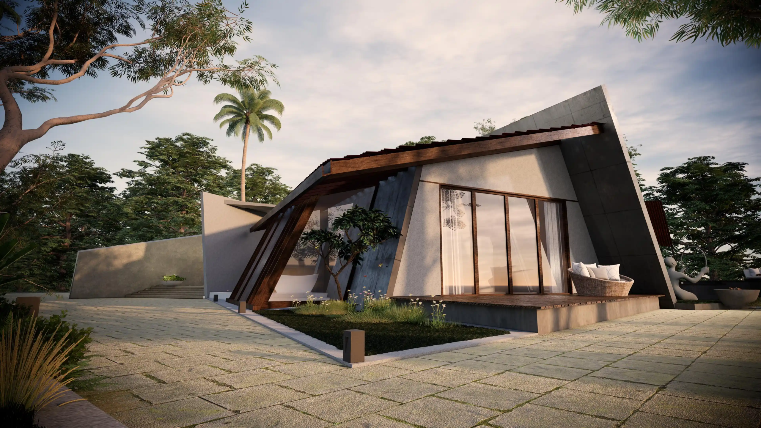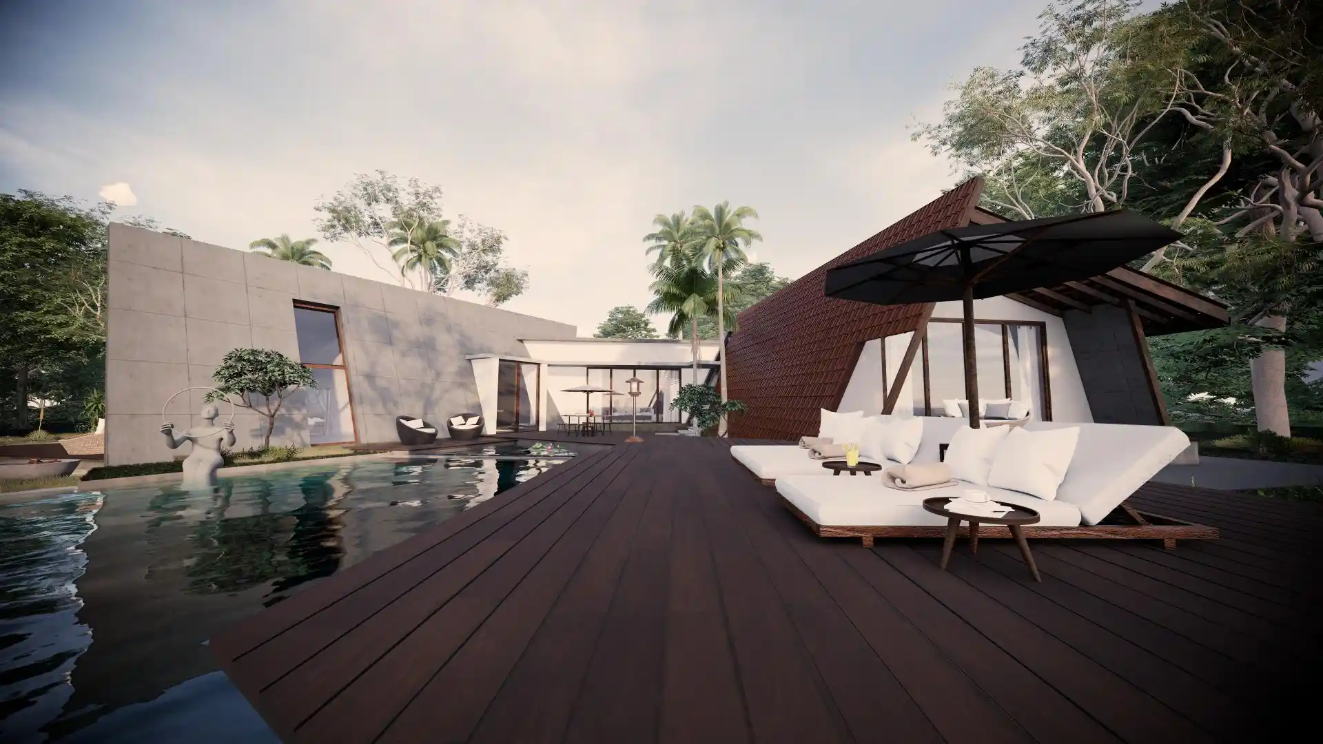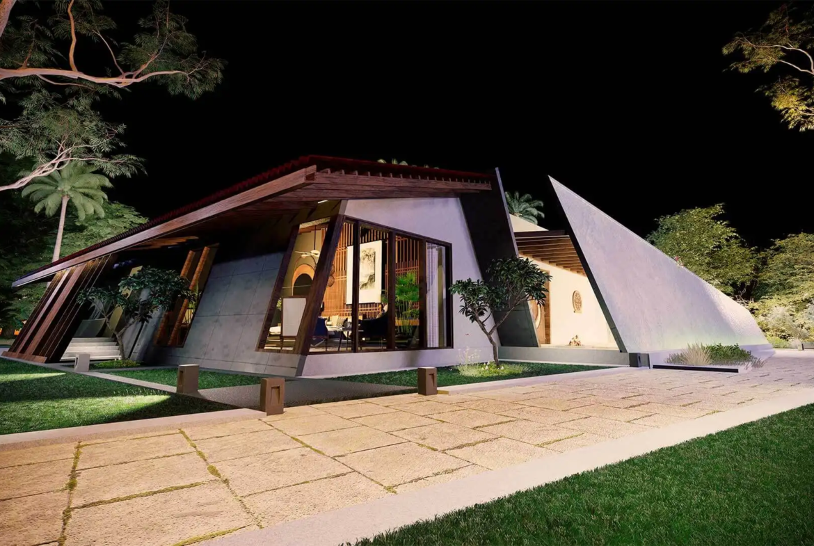3 Bed • 3 Bath | Built-up: 3713.55 sq.ft | Deck: 1585 sq.ft | Total: 5298.55 sq.ft | Hawaiian Architecture | Timeless Edition 1 – Tropical Tints | Ground Floor | Recommended Plot: ~15,895.5 sq.ft | Timeline: 25 Weeks | Green Quotient: 80/100 | Durability: 2× Stronger Than Traditional Construction
