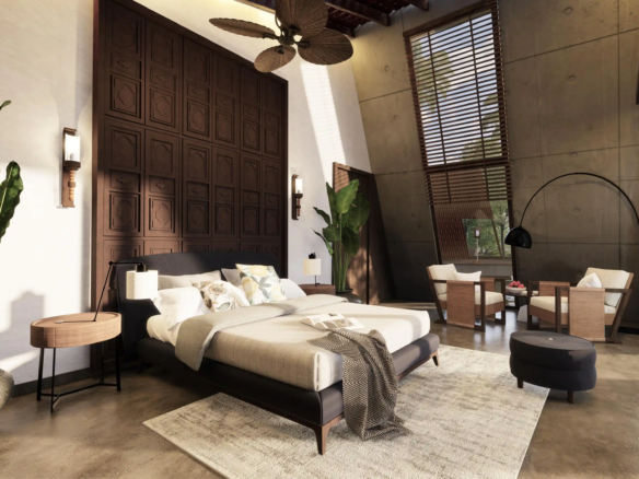 A modern take on the tropical home, the villa uses design elements, materials and finishes of Hawaiian architecture. Spread across 2760 Sq.ft. of area, this luxury abode is designed to evoke a sense of relaxation and excitement. Drawing inspiration from the sloping roofs of a typical Hawaiian villa, the terracotta-clad exterior walls make a bold statement. These walls are delicately juxtaposed with the wooden deck and concrete-finished walls, standing tall, like those of a sanctuary. A grand wooden door and muted walls greet visitors at the entrance, setting the tone of the villa – striking and luxurious. The double-height living room is flanked by the dining room and a bedroom on one side and two bedrooms on the other. During the day, the living room changes its moods as dramatic sun’s rays permeate the space through the skylight. The low-seating dining room by the pond is a nod to ‘ohana’, which means family, an inherent part of the Hawaiian culture. Overlooking the infinity pool, the outdoor dining area is a relaxing spot to enjoy a meal, while the expansive wooden deck is perfect for soaking up in the sun and appreciate the view. The raw, exposed interior finishes in the interiors in harmony with the exteriors blur the lines between the built and unbuilt, offering a connection of the outdoor with the villa. Contemporary on the first impression, the villa’s design has its roots in the island’s authentic architecture, history, and culture. A radical interpretation of the traditional Hawaiian villa, the design is sure to make heads turn.