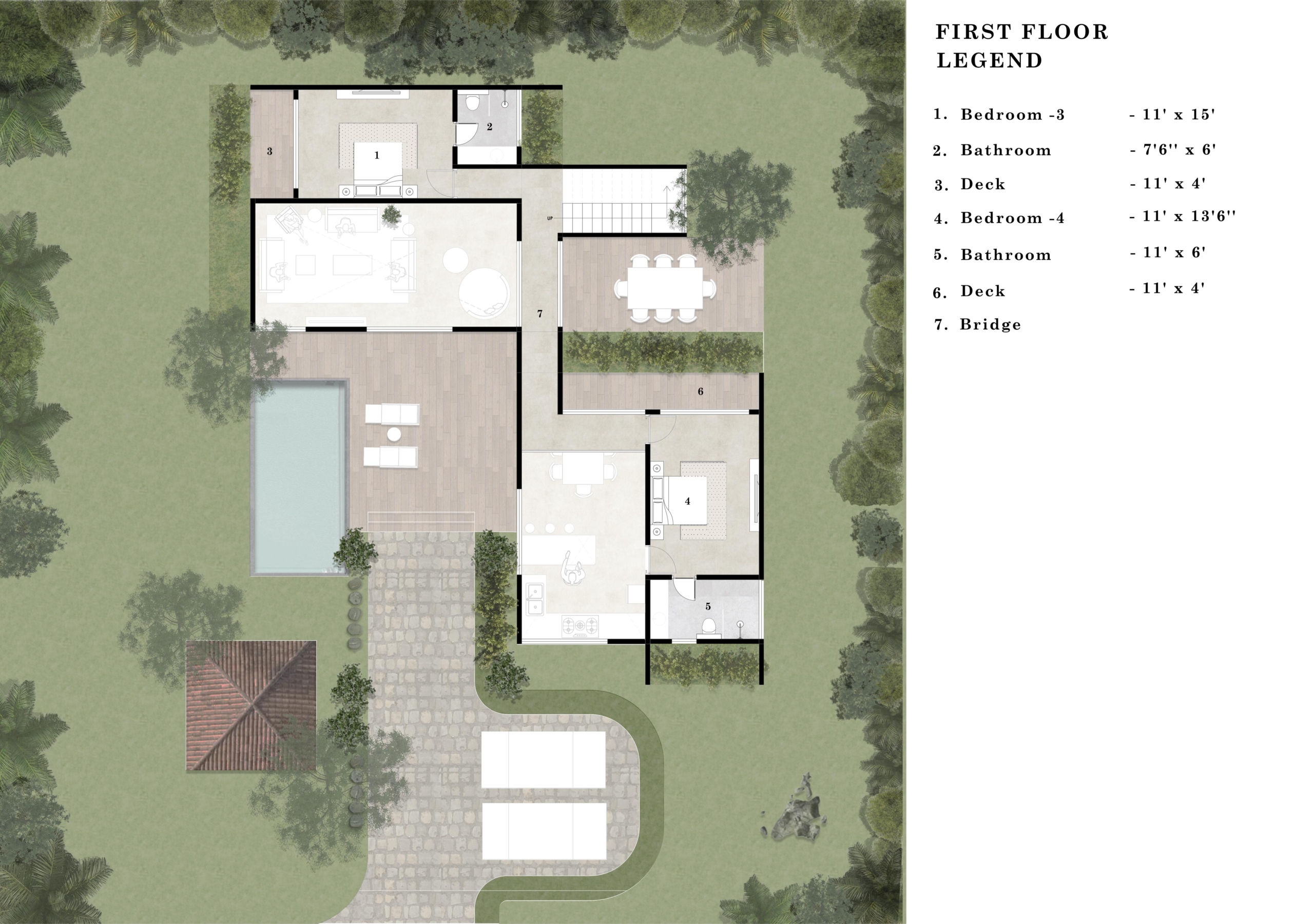1 Foyer, Living Room, 1 Dining Area, 4 Bedrooms, 5 Powder rooms, 1 Staffroom, 1 Bathroom, 1 Deck, 1 Pool(30′ x 10′)