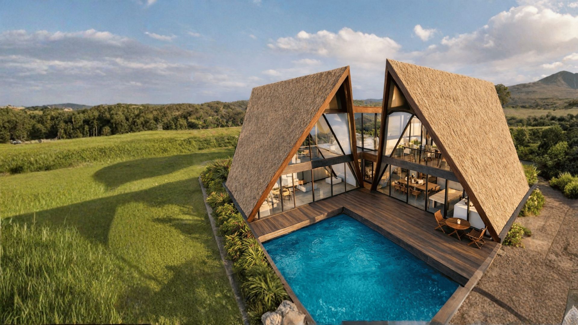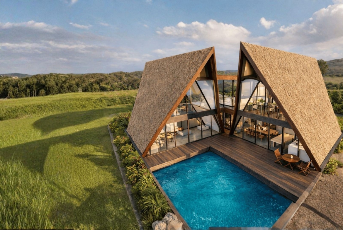 Surrounded by nature, this contemporary retreat consists of two beautifully connected A-frame villas designed for comfort and style. Expansive glass walls invite natural light and frame stunning views of the landscape. Natural materials and warm textures create an inviting, upscale feel, while open living spaces, effortless indoor–outdoor flow, and a peaceful waterside deck make it an ideal private getaway.