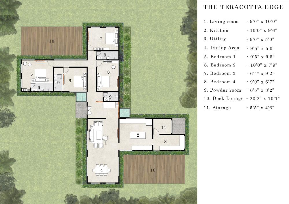1 Living Room, 1 Dining Area, 1Kitchen, 1 Utility, 1 Storage, 1 Deck Lounge, 4 Bedrooms, 4 Powder rooms