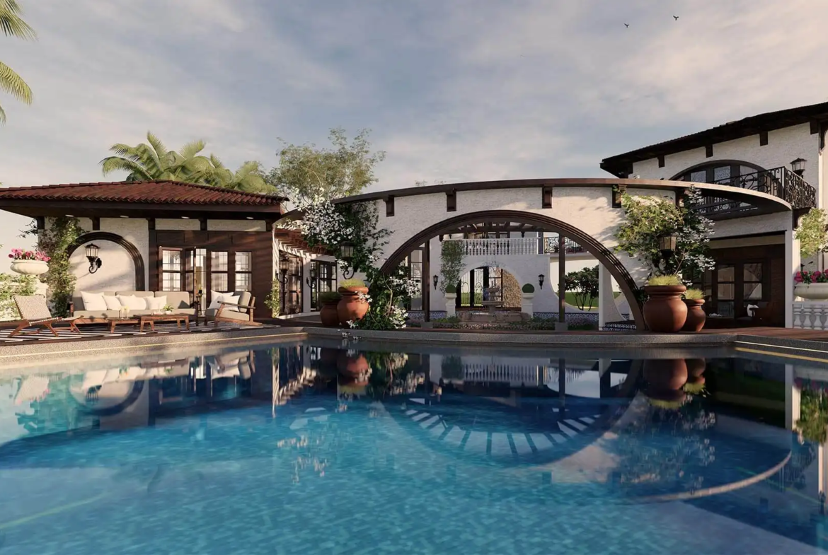 A modern manifestation of traditional Spanish elegance, this villa exudes a sense of warmth and relaxation. Natural finishes, ornamental details and outdoor spaces with a dash of extravagance make this villa a beautiful Mediterranean dream. Clad in terracotta tiles, the staggered roof strikes a balance with the white stucco walls. The villa is planned on a circular layout circumscribed by an infinity pool, across 6200 Sq.ft. The double-height, semi-circular arch at the entrance porch defines the grandeur and splendour that follows, while the upside-down arches are an unexpected visual treat.