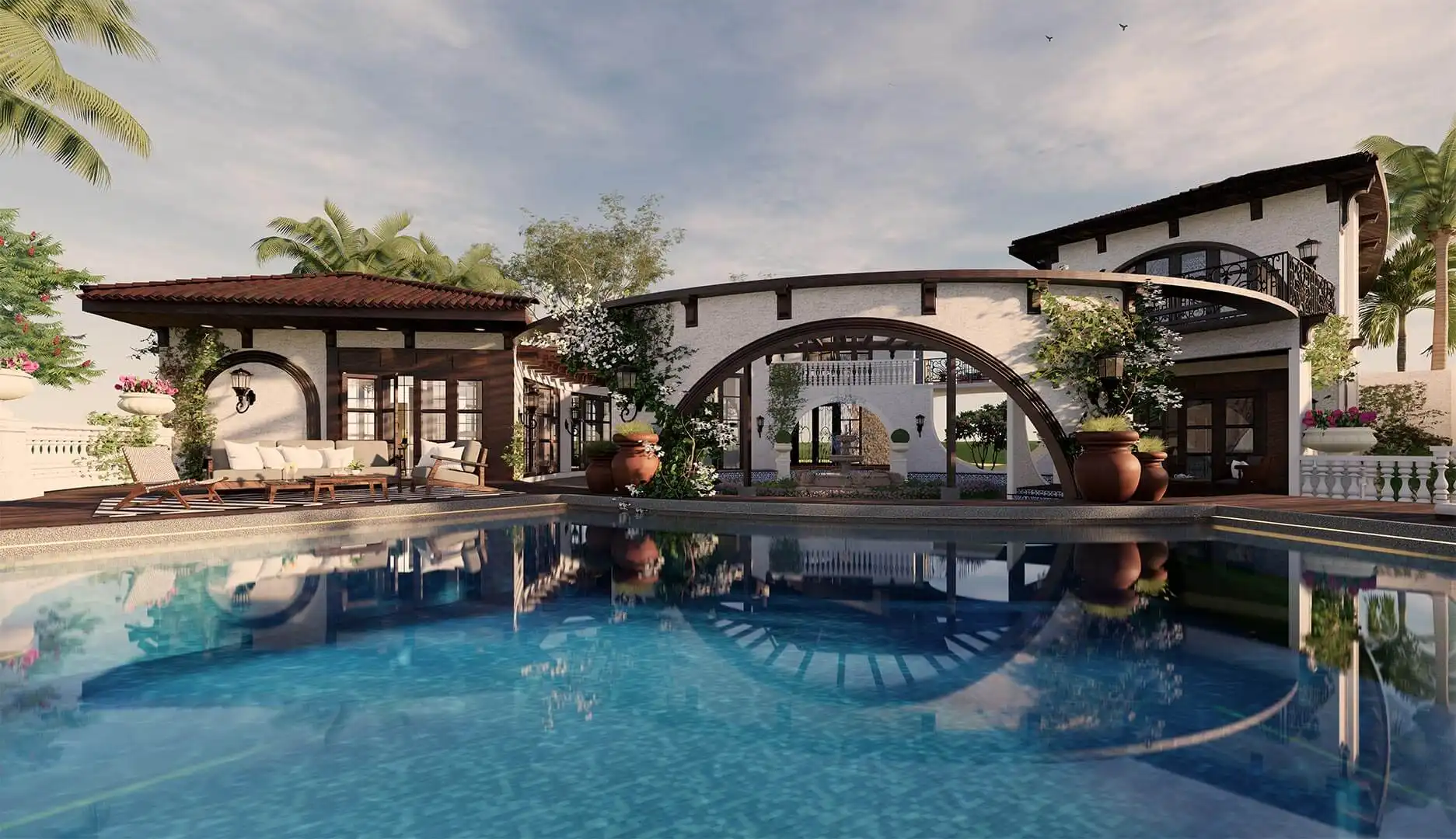 A modern manifestation of traditional Spanish elegance, this villa exudes a sense of warmth and relaxation. Natural finishes, ornamental details and outdoor spaces with a dash of extravagance make this villa a beautiful Mediterranean dream. Clad in terracotta tiles, the staggered roof strikes a balance with the white stucco walls. The villa is planned on a circular layout circumscribed by an infinity pool, across 6200 Sq.ft. The double-height, semi-circular arch at the entrance porch defines the grandeur and splendour that follows, while the upside-down arches are an unexpected visual treat.
