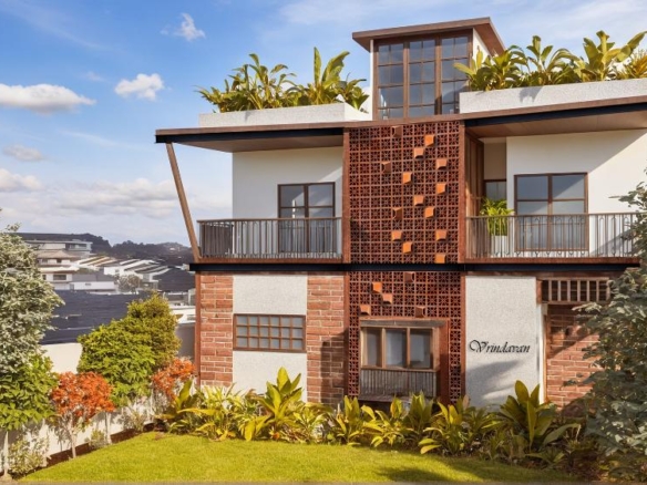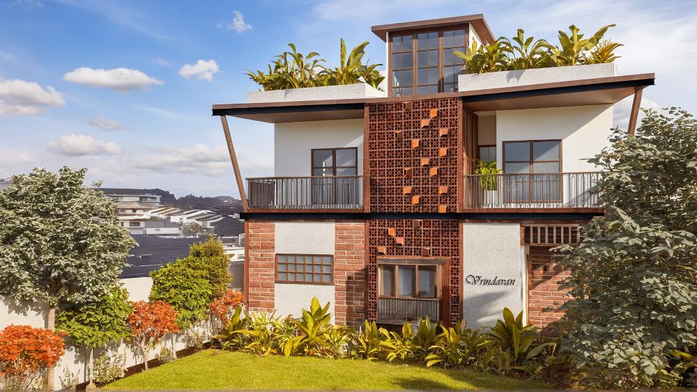 Vrindavan House is a contemporary tropical home featuring exposed brick, clean white façades, and a central jaali screen for natural light and ventilation. With open balconies and a green terrace, the design offers a calm, climate-responsive living experience.